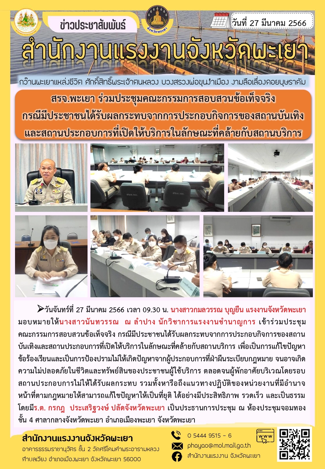 สรจ.พะเยา ร่วมประชุมคณะกรรมการสอบสวนข้อเท็จจริง กรณีมีประชาชนได้รับผลกระทบจากการประกอบกิจการของสถานบันเทิงและสถานประกอบการที่เปิดให้บริการในลักษณะที่คล้ายกับสถานบริการ