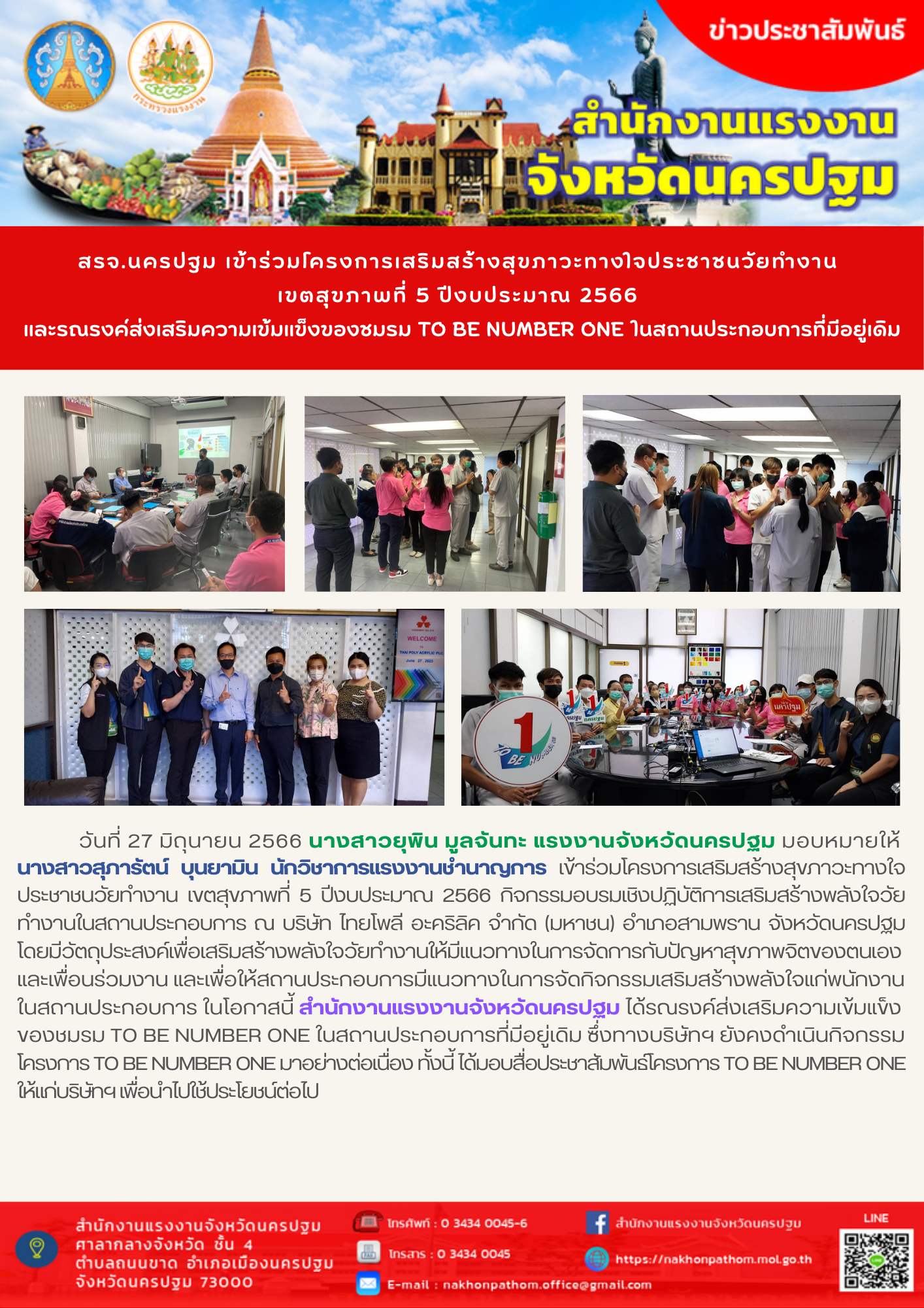 สรจ.นครปฐม เข้าร่วมโครงการเสริมสร้างสุขภาวะทางใจประชาชนวัยทำงาน เขตสุขภาพที่ 5 ปีงบประมาณ 2566 และรณรงค์ส่งเสริมความเข้มแข็งของชมรม TO BE NUMBER ONE ในสถานประกอบการที่มีอยู่เดิม