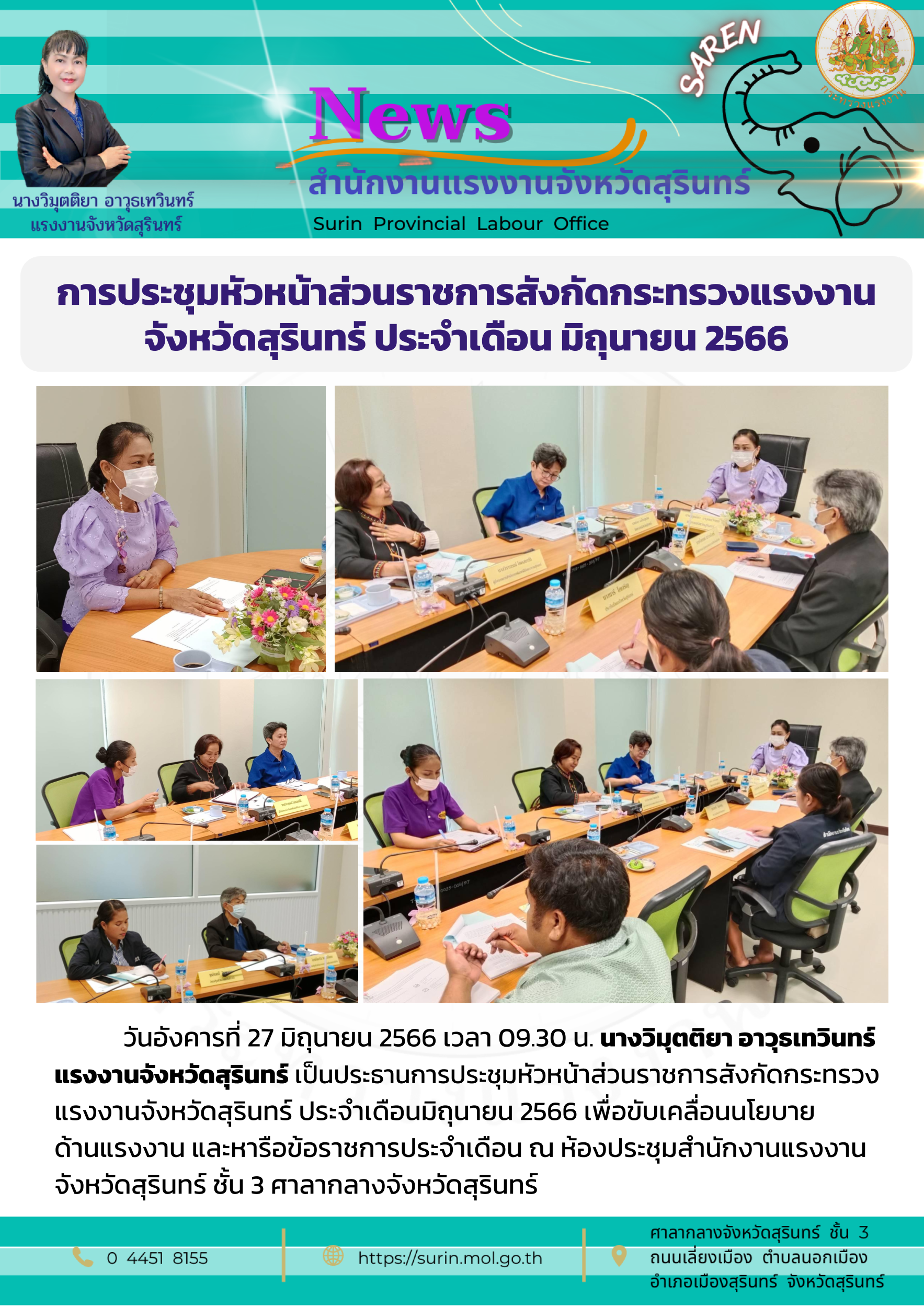 การประชุมหัวหน้าส่วนราชการสังกัดกระทรวงแรงงานจังหวัดสุรินทร์ ประจำเดือน มิถุนายน 2566