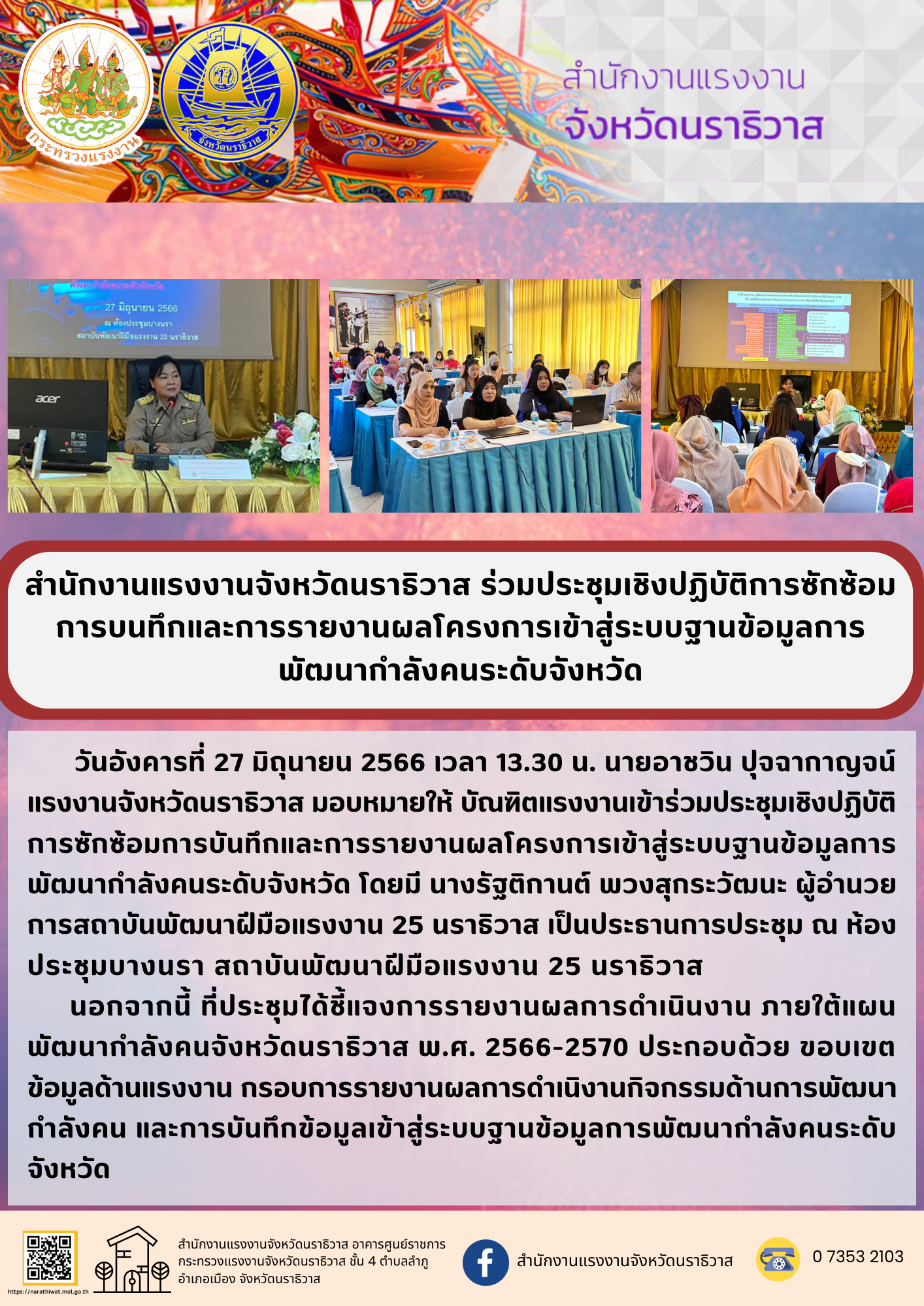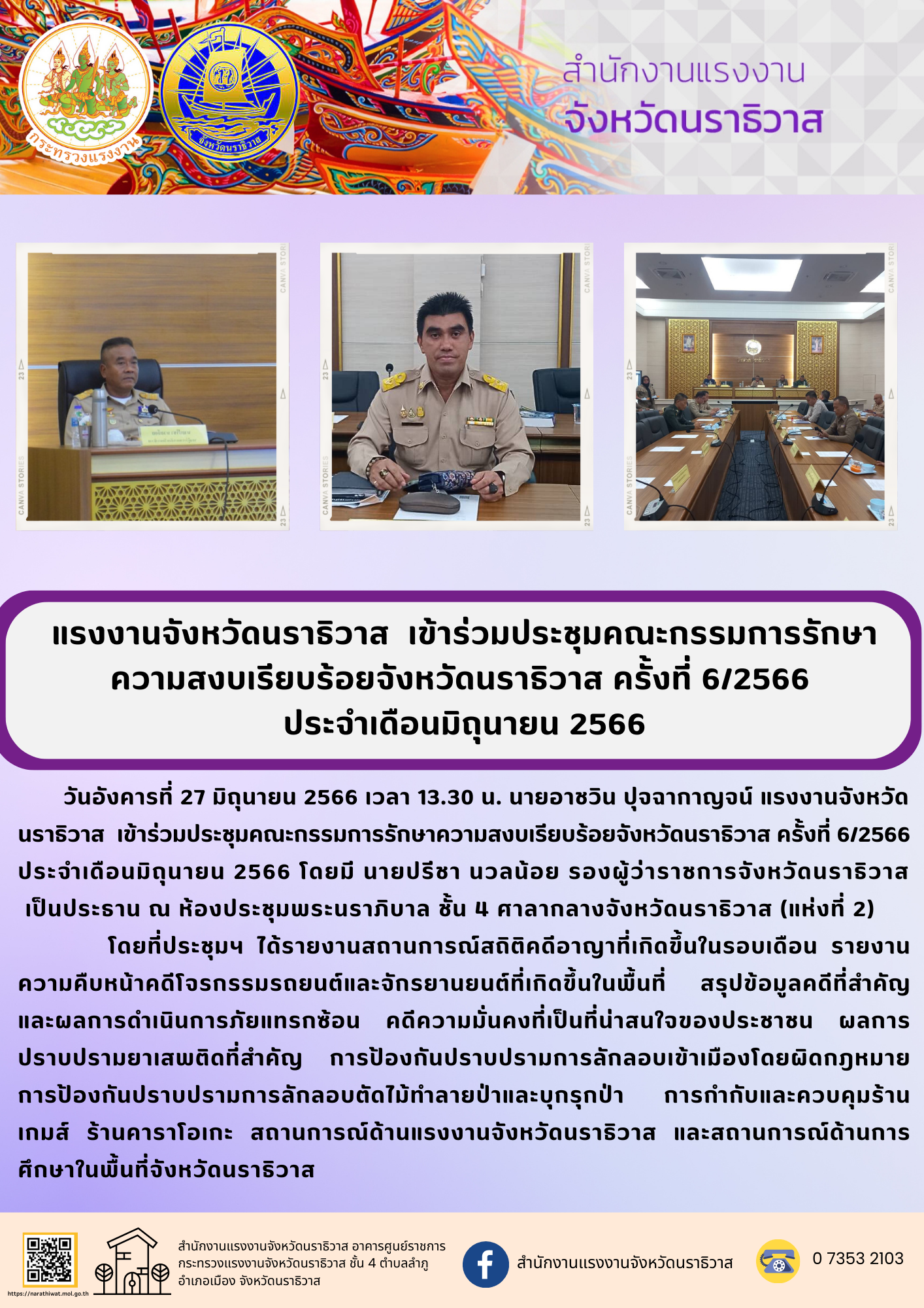 แรงงานจังหวัดนราธิวาส เข้าร่วมประชุมคณะกรรมการรักษาความสงบเรียบร้อยจังหวัดนราธิวาส ครั้งที่ 6/2566 ประจำเดือนมิถุนายน 2566