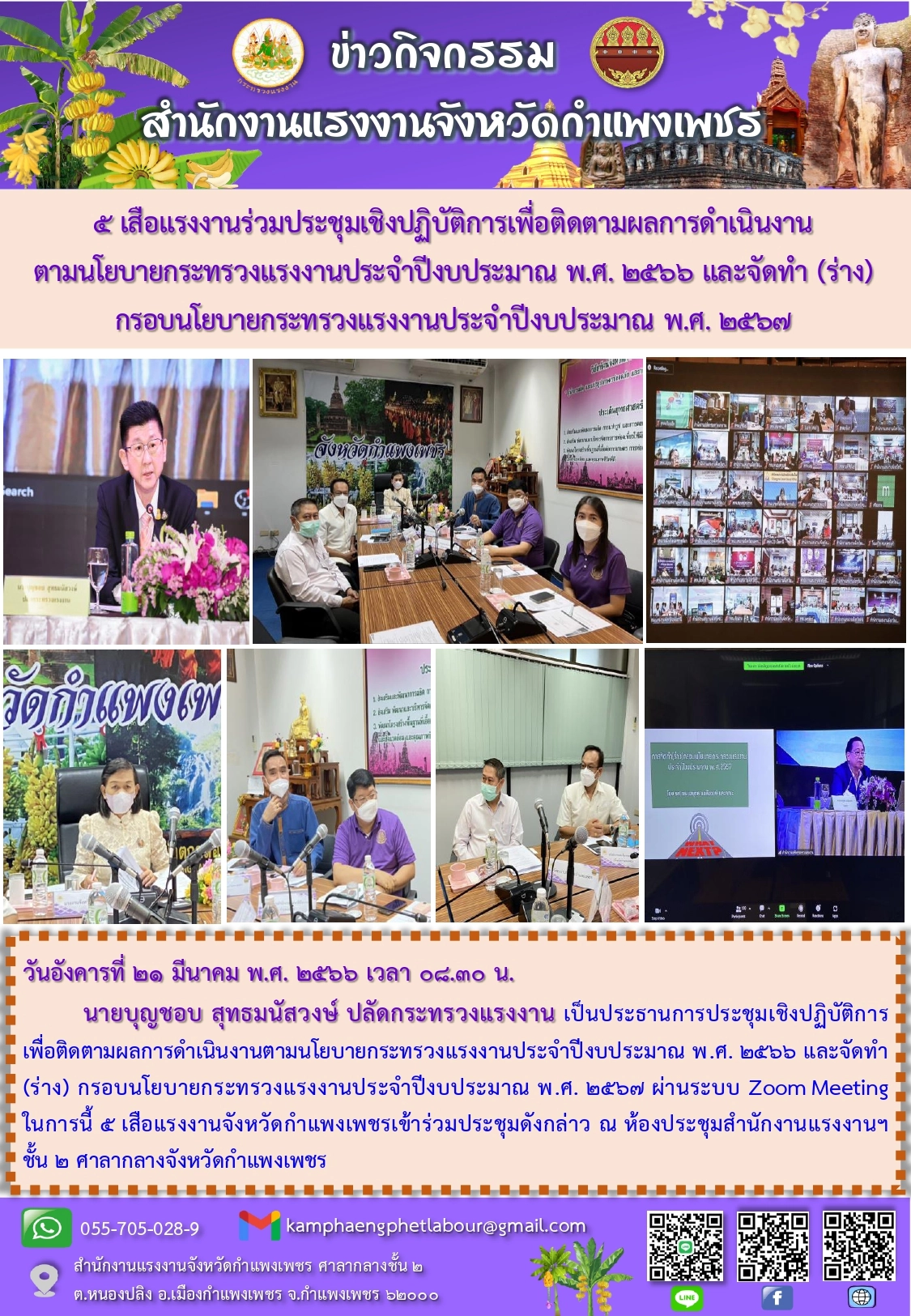 สรจ.กำแพงเพชร 5 เสือแรงงานร่วมประชุมเชิงปฏิบัติการเพื่อติดตามผลการดำเนินงานตามนโยบายกระทรวงแรงงานประจำปีงบประมาณ พ.ศ. 2566 และจัดทำ (ร่าง) กรอบนโยบายกระทรวงแรงงานประจำปีงบประมาณ พ.ศ. 2567