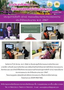 สรจ.สตูล เข้าร่วมการประชุมเชิงปฏิบัติการเพื่อติดตามผลการดำเนินงานตามนโยบายกระทรวงแรงงาน ประจำปีงบประมาณ พ.ศ.2566 และจัดทำ (ร่าง)กรอบนโยบายกระทรวงแรงงาน ประจำปีงบประมาณ พ.ศ.2567 ผ่านระบบ VDO Conference