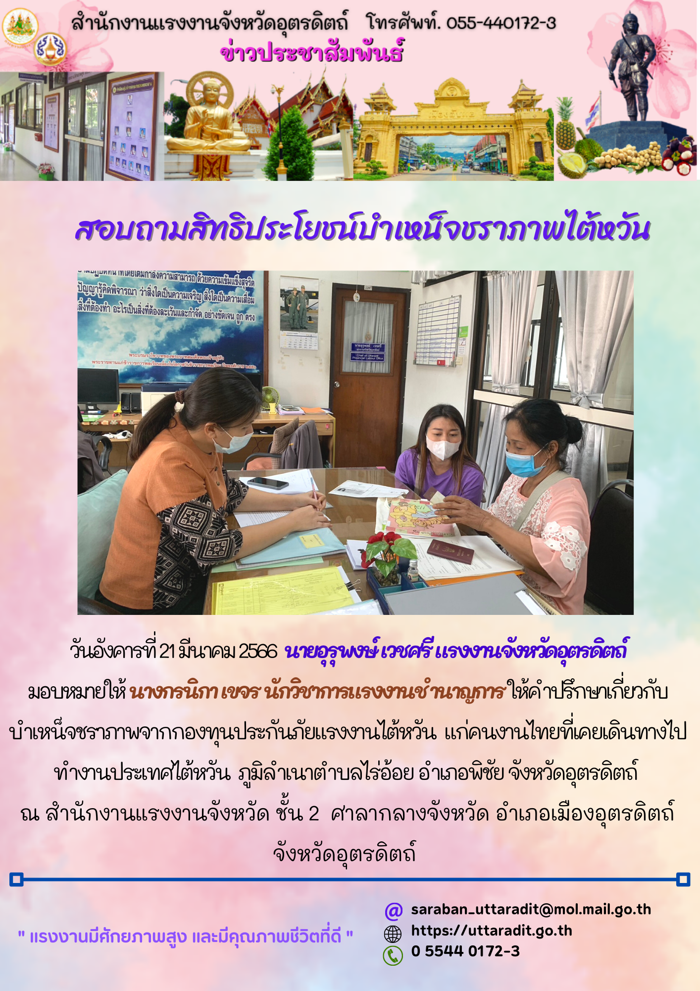 สรจ.อต. ให้คำปรึกษาเกี่ยวกับสิทธิประโยชน์บำเหน็จชราภาพจากกองทุนประกันภัยแรงงานไต้หวัน
