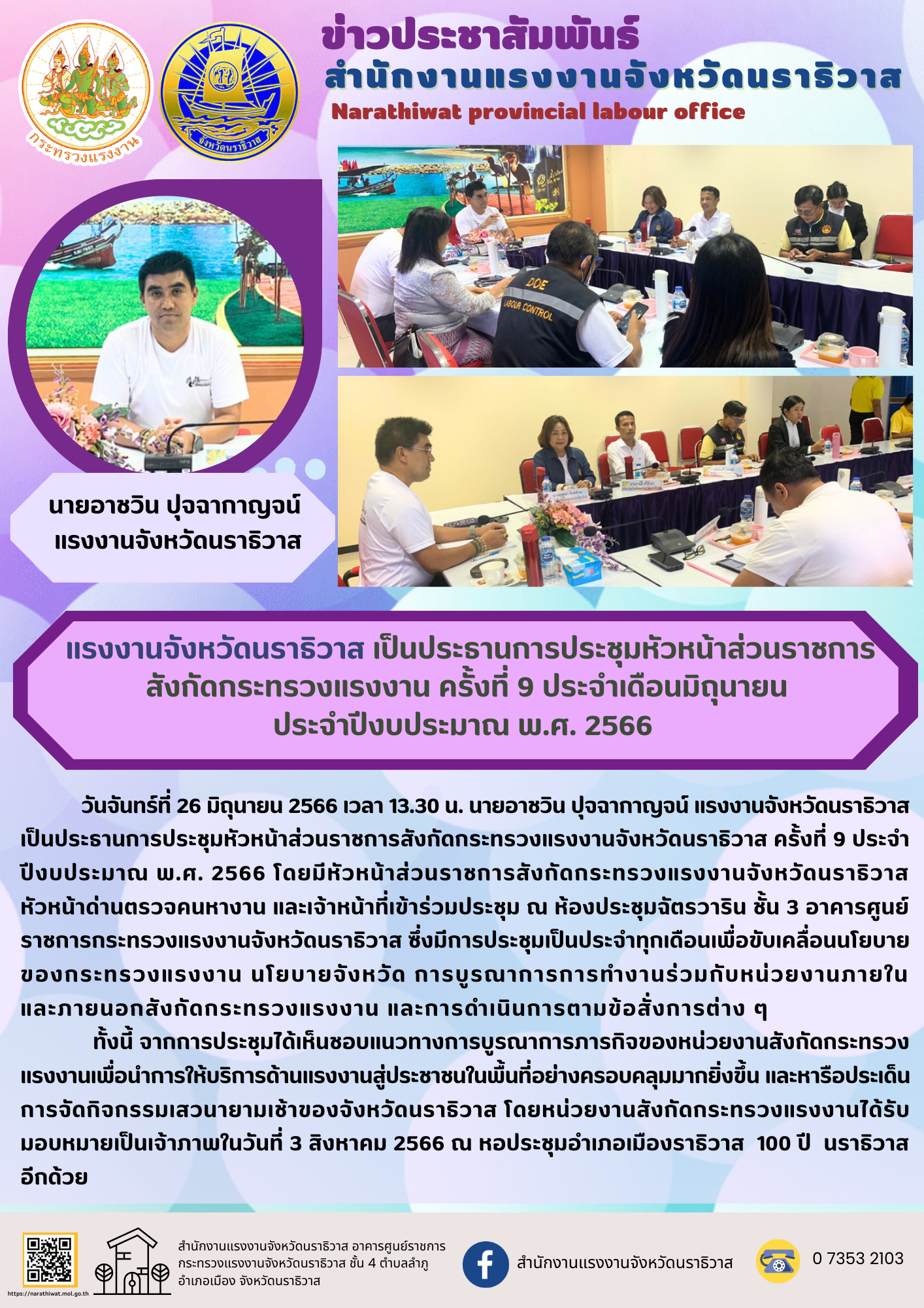 สรจ.นราธิวาส เป็นประธานการประชุมหัวหน้าส่วนราชการสังกัดกระทรวงแรงงาน ครั้งที่ 9 ประจำเดือนมิถุนายน ประจำปีงบประมาณ พ.ศ. 2566