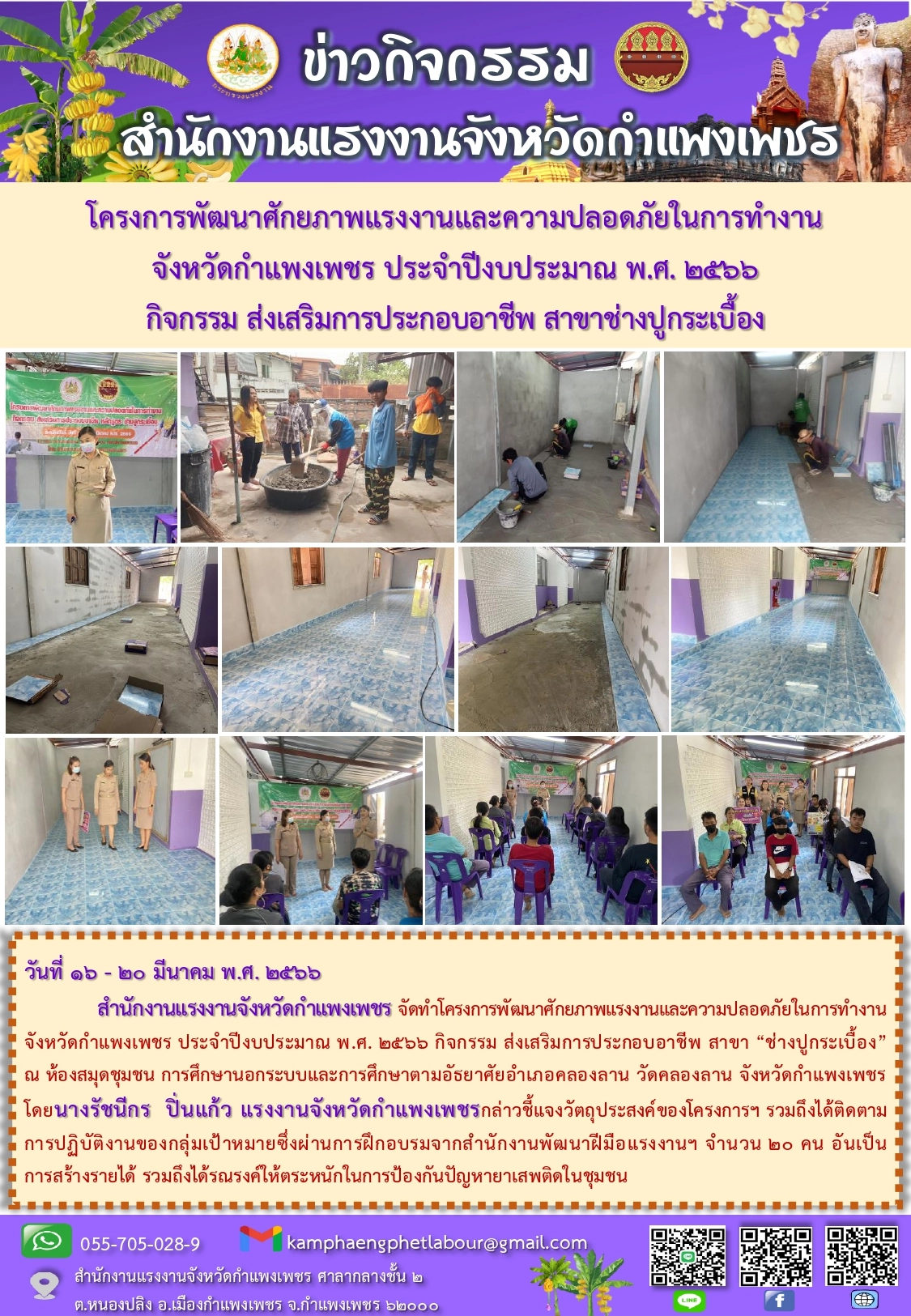 สรจ.กำแพงเพชร โครงการพัฒนาศักยภาพแรงงานและความปลอดภัยในการทำงาน จังหวัดกำแพงเพชร ประจำปีงบประมาณ พ.ศ. 2566 กิจกรรม ส่งเสริมการประกอบอาชีพ สาขาช่างปูกระเบื้อง