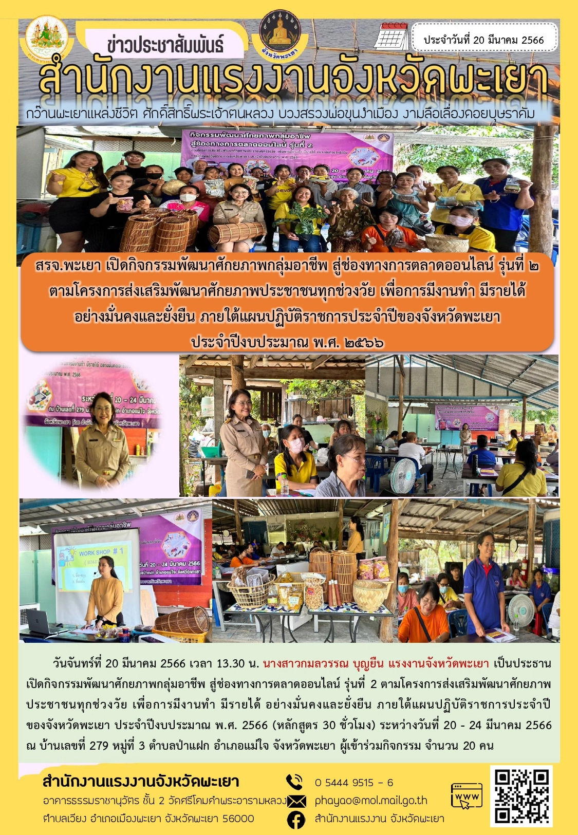 สรจ.พะเยา เปิดกิจกรรมพัฒนาศักยภาพกลุ่มอาชีพ สู่ช่องทางการตลาดออนไลน์ รุ่นที่ 2 ตามโครงการส่งเสริมพัฒนาศักยภาพประชาชนทุกช่วงวัย เพื่อการมีงานทำ มีรายได้ อย่างมั่นคงและยั่งยืน ภายใต้แผนปฏิบัติราชการประจำปีของจังหวัดพะเยา ประจำปีงบประมาณ พ.ศ. 2566