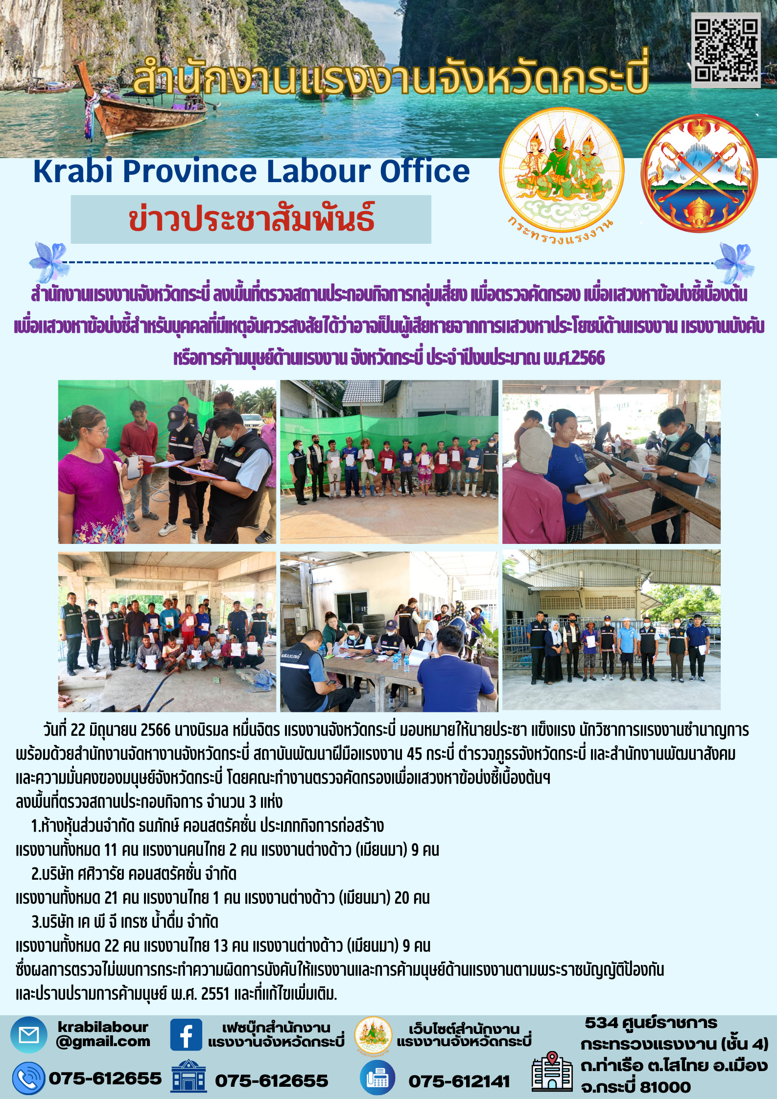 สรจ.กระบี่ ลงพื้นที่ตรวจสถานประกอบกิจการกลุ่มเสี่ยง เพื่อตรวจคัดกรอง เพื่อแสวงหาข้อบ่งชี้เบื้องต้น เพื่อแสวงหาข้อบ่งชี้สำหรับบุคคลที่มีเหตุอันควรสงสัยได้ว่าอาจเป็นผู้เสียหายจากการแสวงหาประโยชน์ด้านแรงงาน แรงงานบังคับ หรือการค้ามนุษย์ด้านแรงงาน จังหวัดกระบี่ ประจำปีงบประมาณ พ.ศ.2566