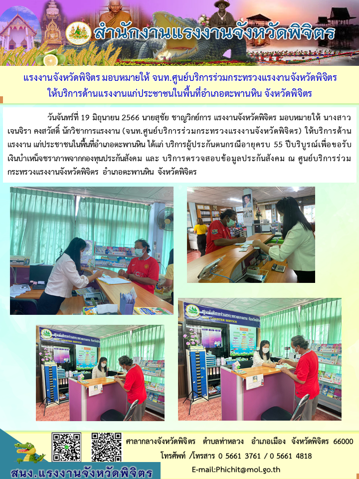 จนท.ศูนย์บริการร่วมกระทรวงแรงงานจังหวัดพิจิตร ให้บริการด้านแรงงานแก่ประชาชนในพื้นที่อำเภอตะพานหิน จังหวัดพิจิตร