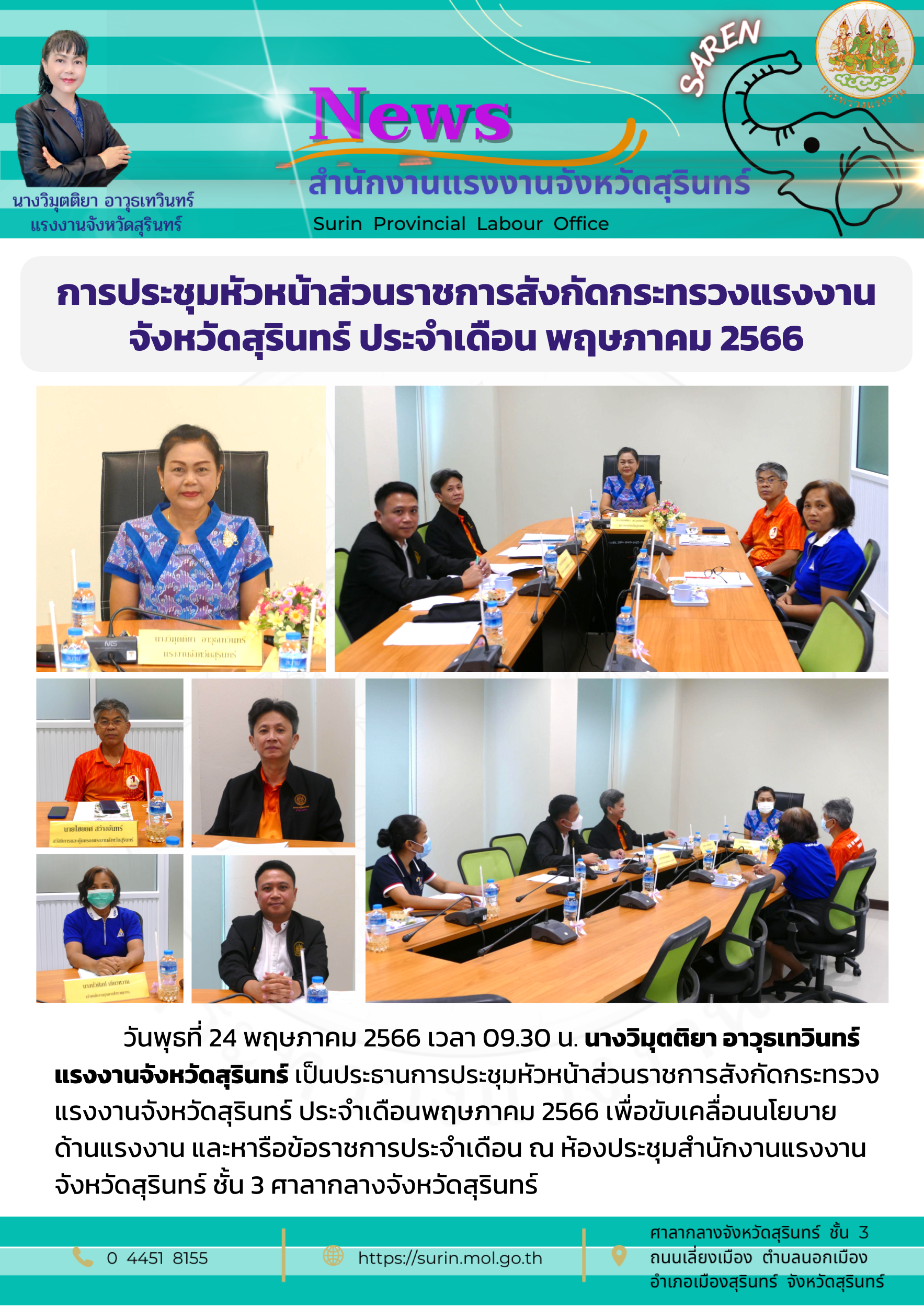การประชุมหัวหน้าส่วนราชการสังกัดกระทรวงแรงงานจังหวัดสุรินทร์ ประจำเดือน พฤษภาคม 2566