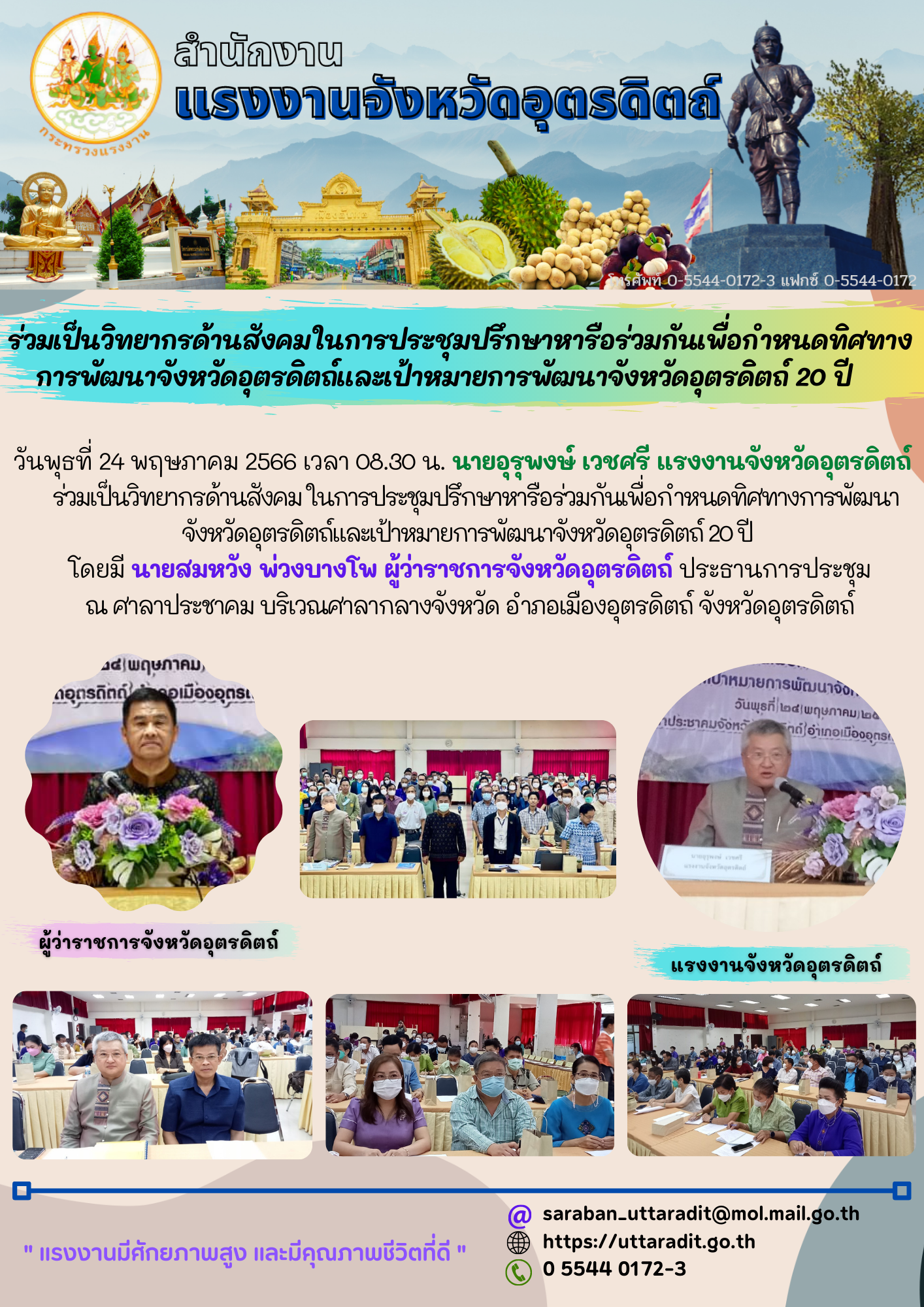 สรจ.อต. ร่วมเป็นวิทยากรด้านสังคมในการประชุมปรึกษาหารือร่วมกันเพื่อกำหนดทิศทางการพัฒนาจังหวัดอุตรดิตถ์และเป้าหมายการพัฒนาจังหวัดอุตรดิตถ์ 20 ปี
