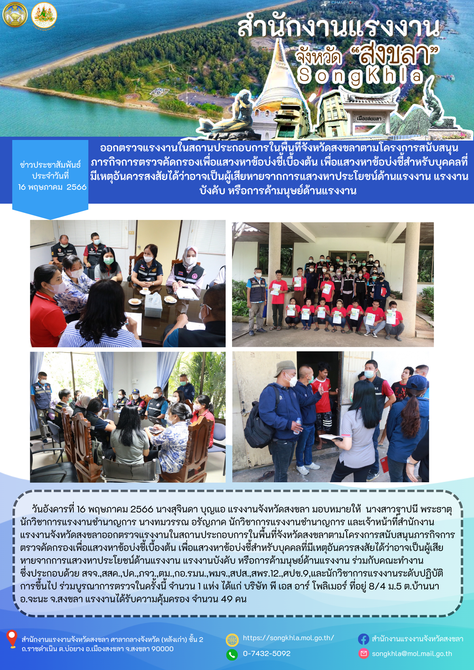 สรจ.สงขลา ออกตรวจแรงงานในสถานประกอบการในพื้นที่จังหวัดสงขลาตามโครงการสนับสนุนภารกิจการตรวจคัดกรองเพื่อแสวงหาข้อบ่งชี้เบื้องต้น เพื่อแสวงหาข้อบ่งชี้สำหรับบุคคลที่มีเหตุอันควรสงสัยได้ว่าอาจเป็นผู้เสียหายจากการแสวงหาประโยชน์ด้านแรงงาน แรงงานบังคับ หรือการค้ามนุษย์ด้านแรงงาน