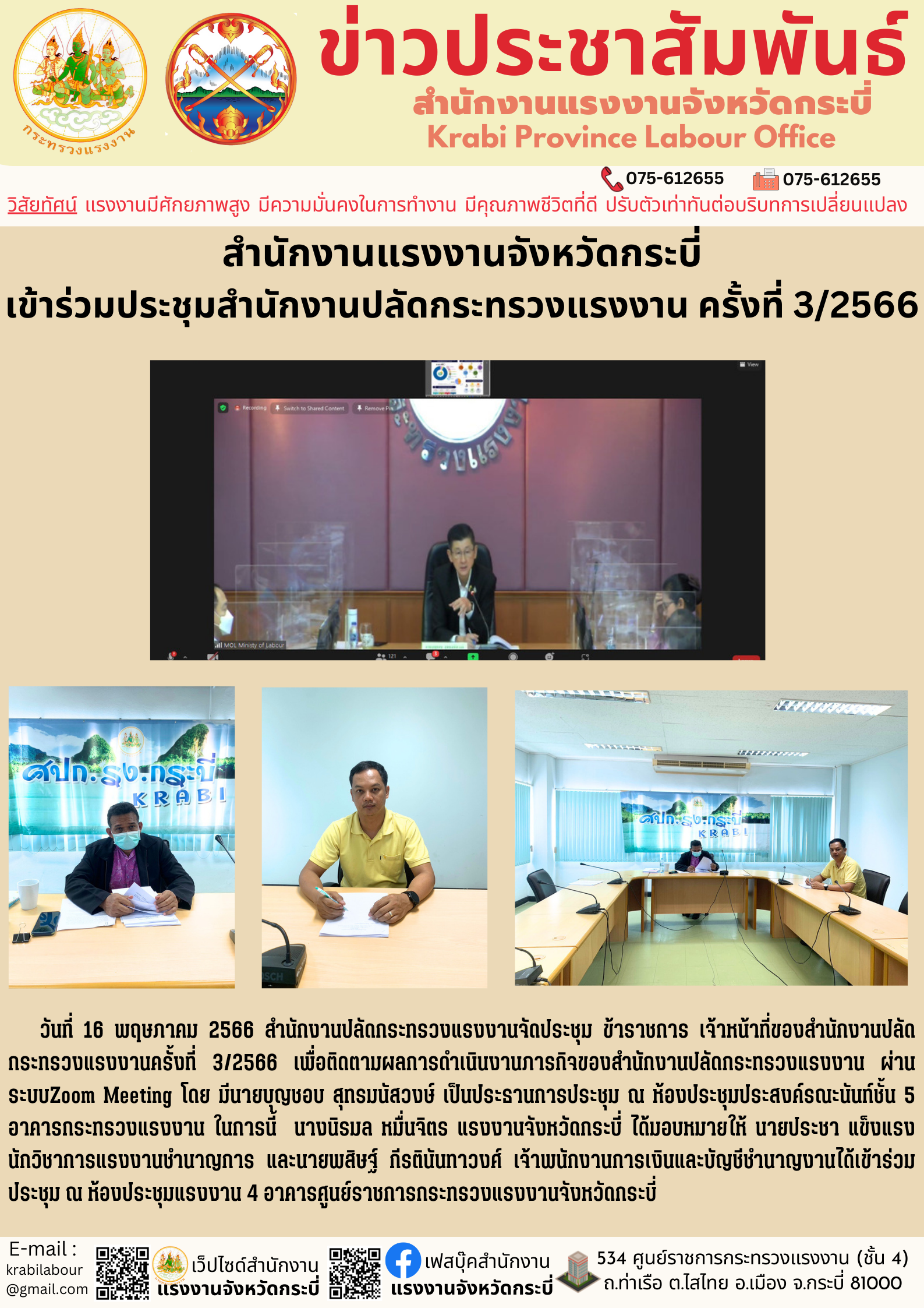 สำนักงานแรงงานจังหวัดกระบี่ เข้าร่วมประชุมสำนักงานปลัดกระทรวงแรงงาน ครั้งที่ 3/2566
