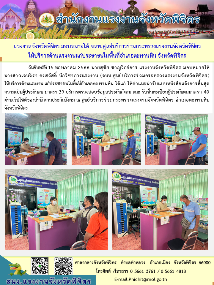 เจ้าหน้าที่ ศูนย์บริการร่วมกระทรวงแรงงานจังหวัดพิจิตร ให้บริการด้านแรงงานแก่ประชาชนในพื้นที่อำเภอตะพานหิน จังหวัดพิจิตร