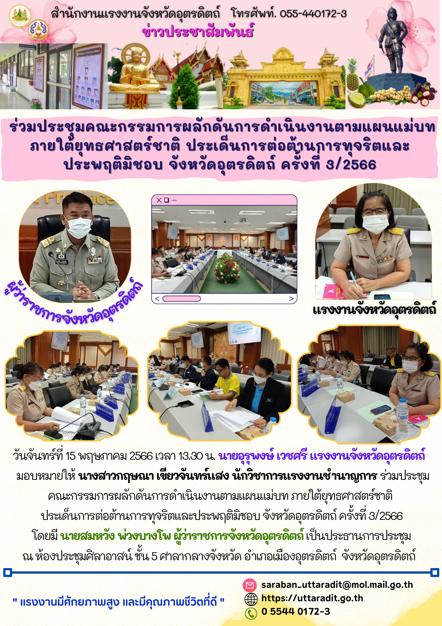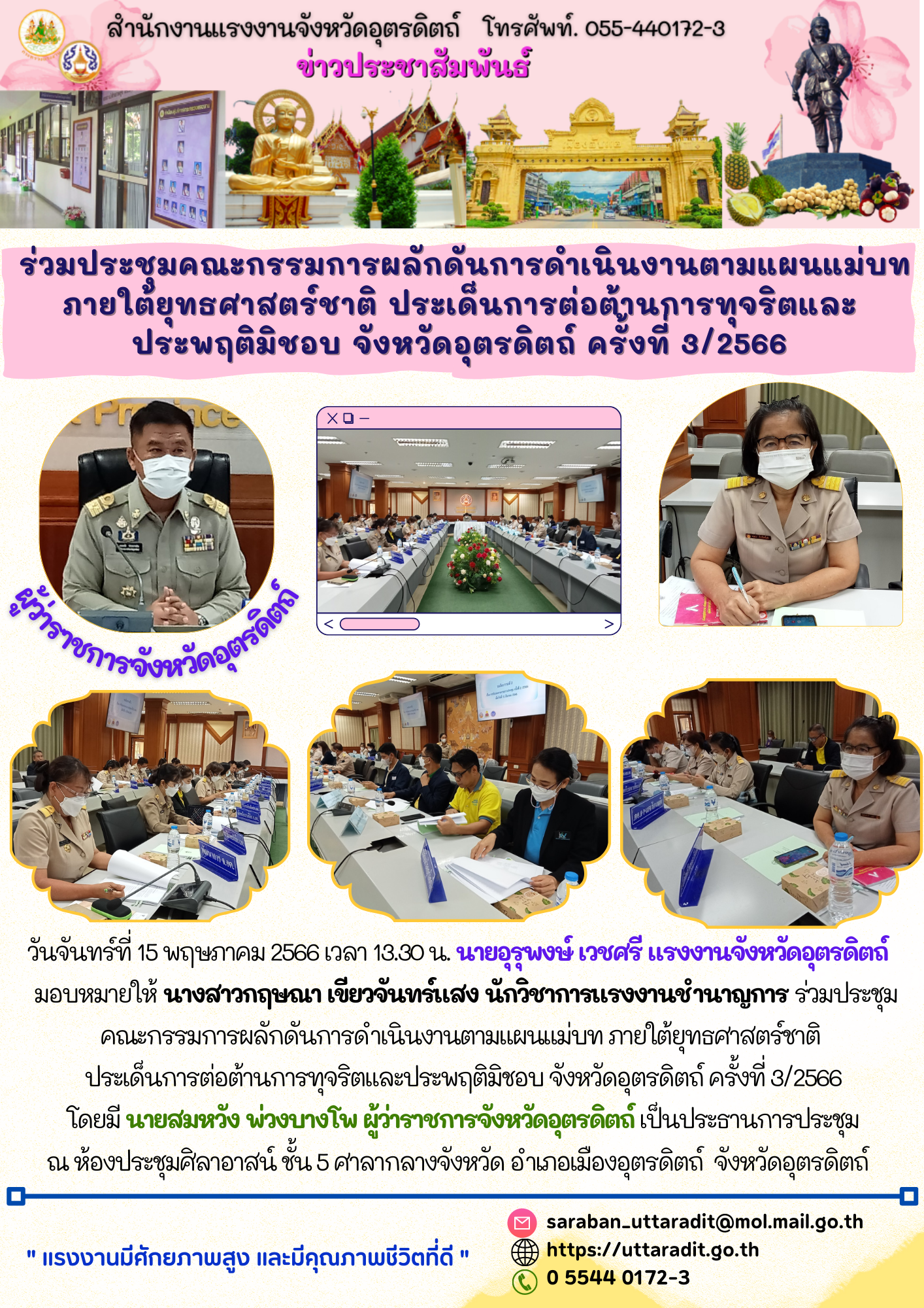 สรจ.อต. ร่วมประชุมคณะกรรมการผลักดันการดำเนินงานตามแผนแม่บท ภายใต้ยุทธศาสตร์ชาติ ประเด็นการต่อต้านการทุจริตและประพฤติมิชอบ จังหวัดอุตรดิตถ์ ครั้งที่ 3/2566