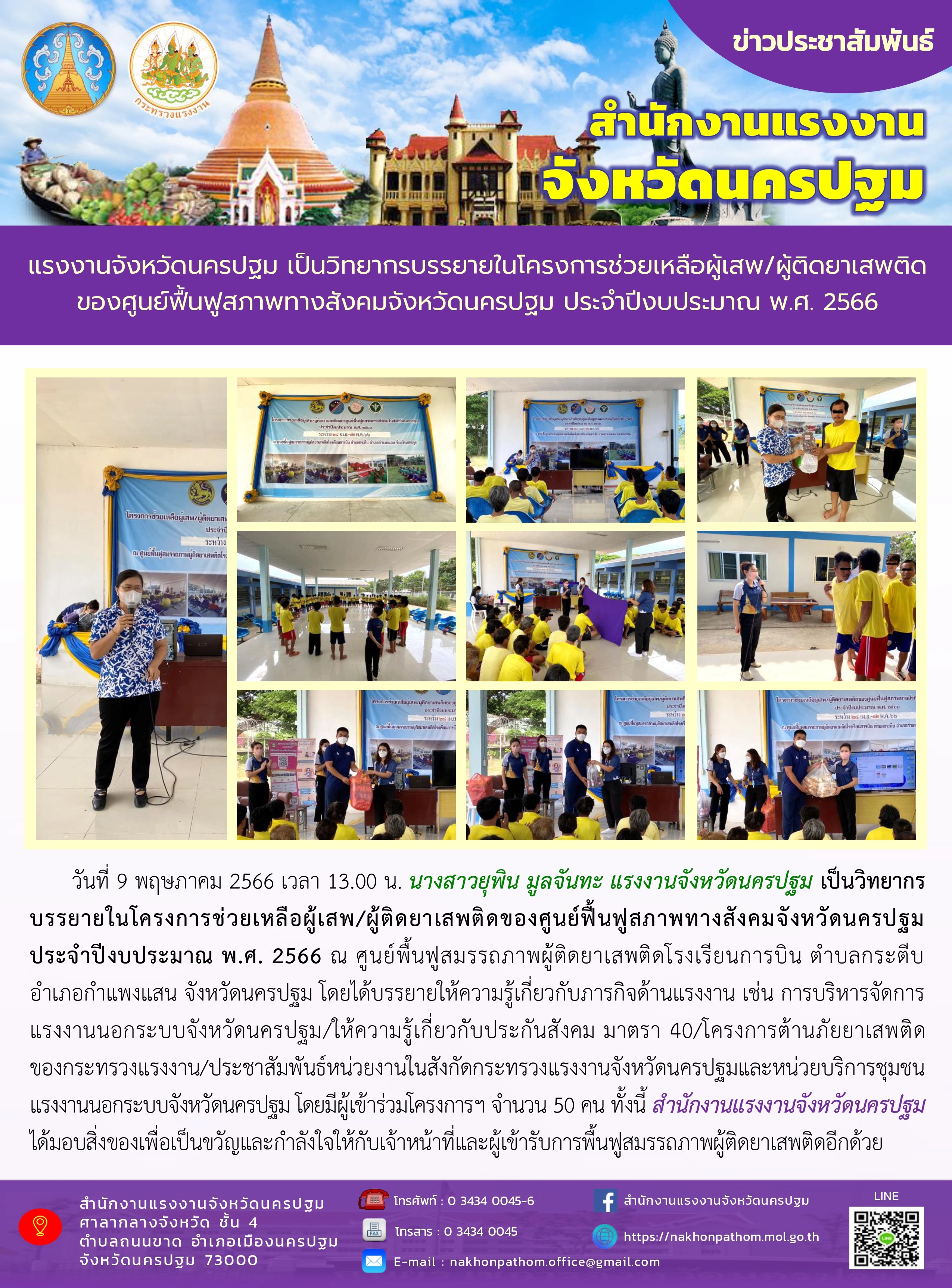 สรจ.นครปฐม เป็นวิทยากรบรรยายในโครงการช่วยเหลือผู้เสพ/ผู้ติดยาเสพติดของศูนย์ฟื้นฟูสภาพทางสังคมจังหวัดนครปฐม ประจำปีงบประมาณ พ.ศ. 2566