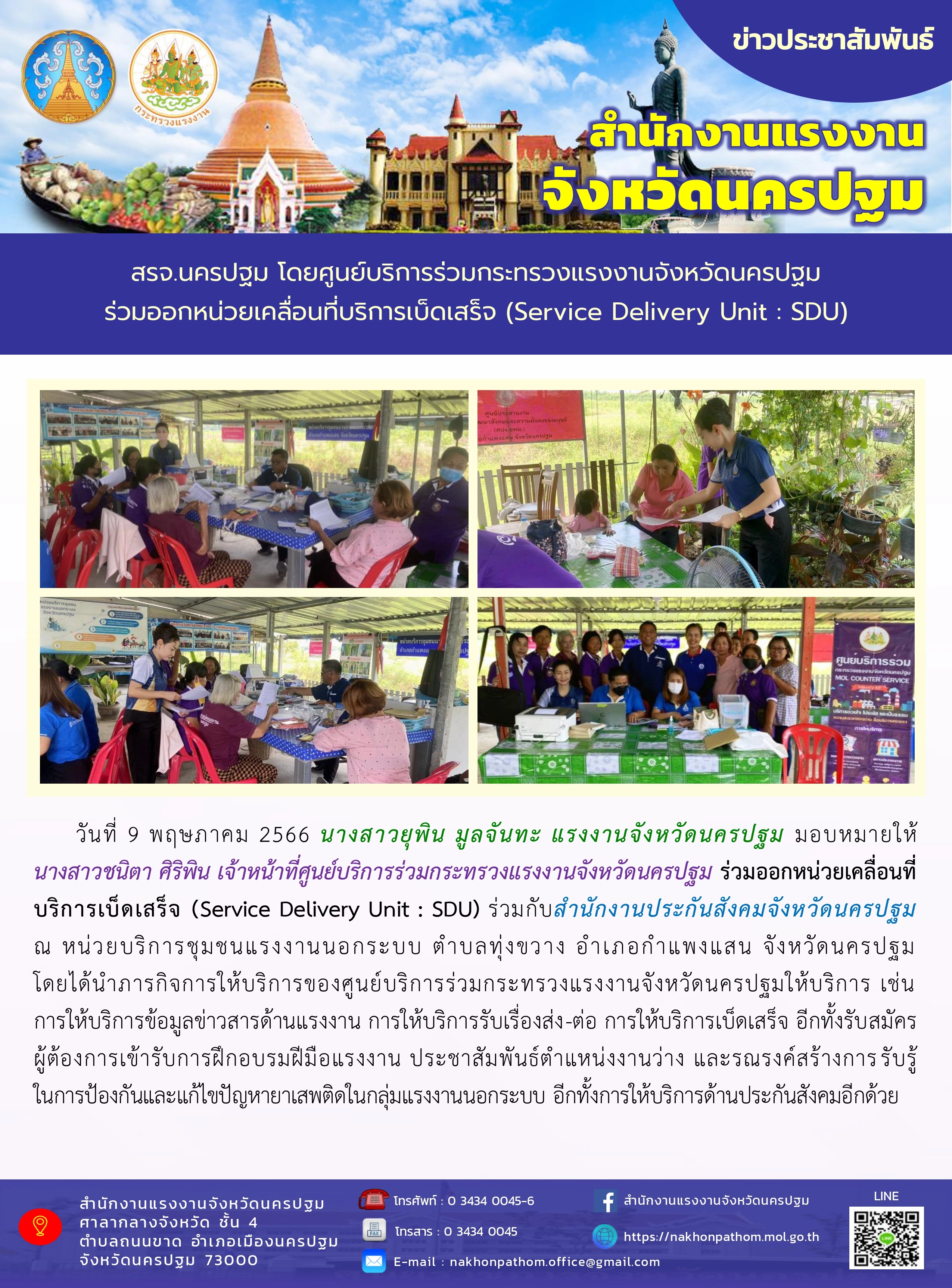 สรจ.นครปฐม โดยศูนย์บริการร่วมกระทรวงแรงงานจังหวัดนครปฐม ร่วมออกหน่วยเคลื่อนที่บริการเบ็ดเสร็จ (Service Delivery Unit : SDU)