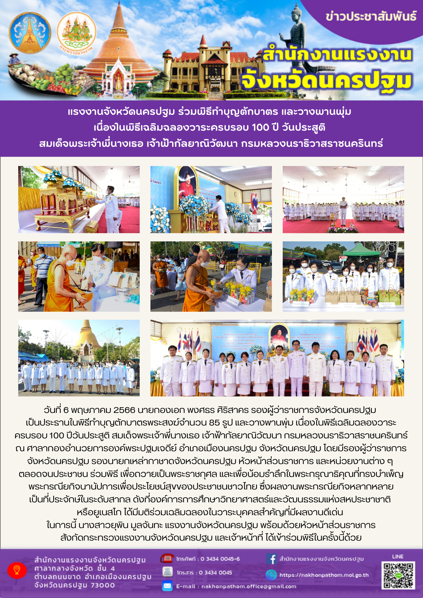 สรจ.นครปฐม ร่วมพิธีทำบุญตักบาตร และวางพานพุ่ม เนื่องในพิธีเฉลิมฉลองวาระครบรอบ 100 ปี วันประสูติ สมเด็จพระเจ้าพี่นางเธอ เจ้าฟ้ากัลยาณิวัฒนา กรมหลวงนราธิวาสราชนครินทร์