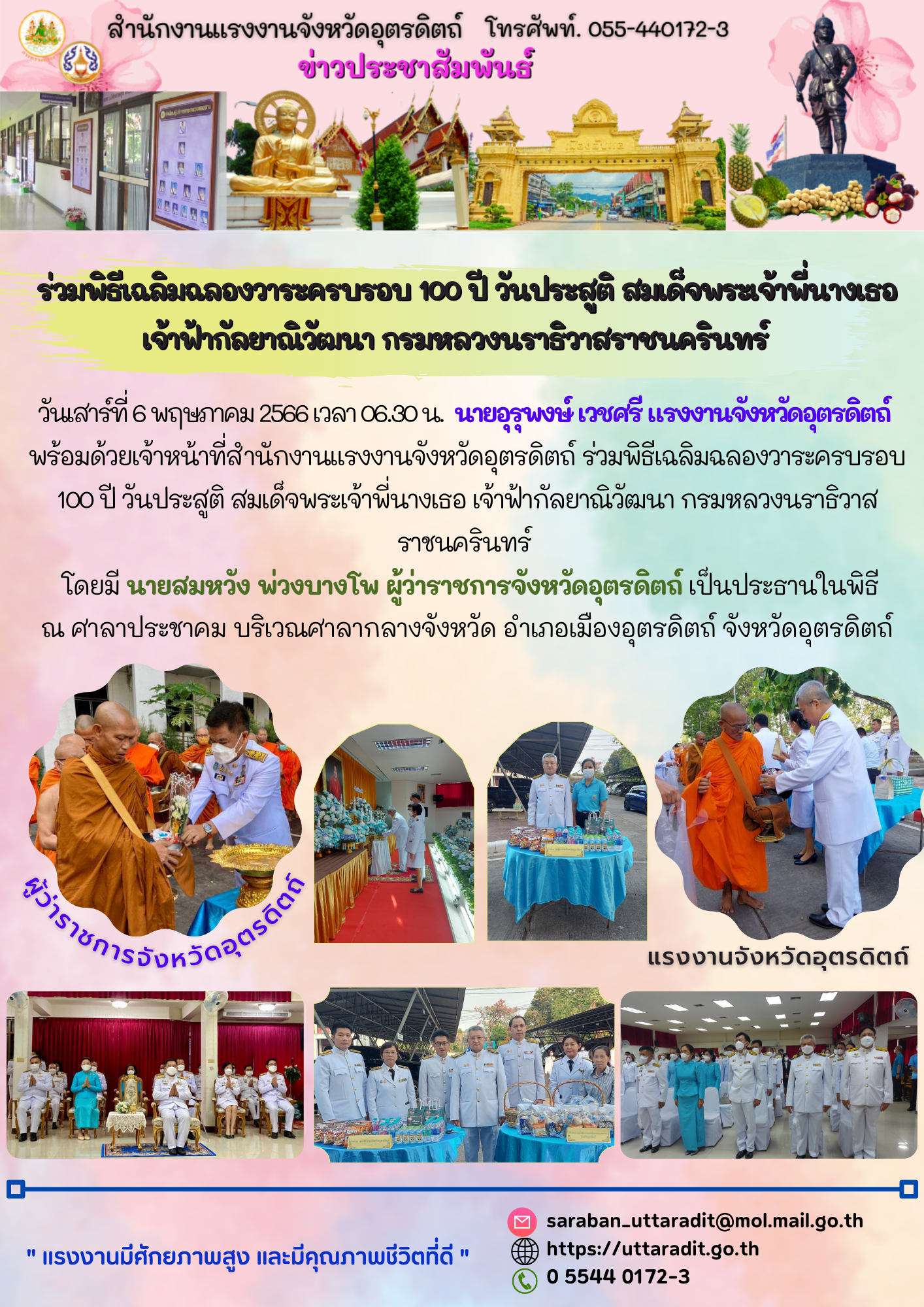 สรจ.พิจิตร มอบหมายเจ้าหน้าที่ร่วมพิธีเฉลิมฉลองวาระครบ 100 ปี วันประสูติ สมเด็จพระเจ้าพี่นางเธอเจ้าฟ้ากัลยาณิวัฒนา กรมหลวงนราธิวาสราชนครินทร์
