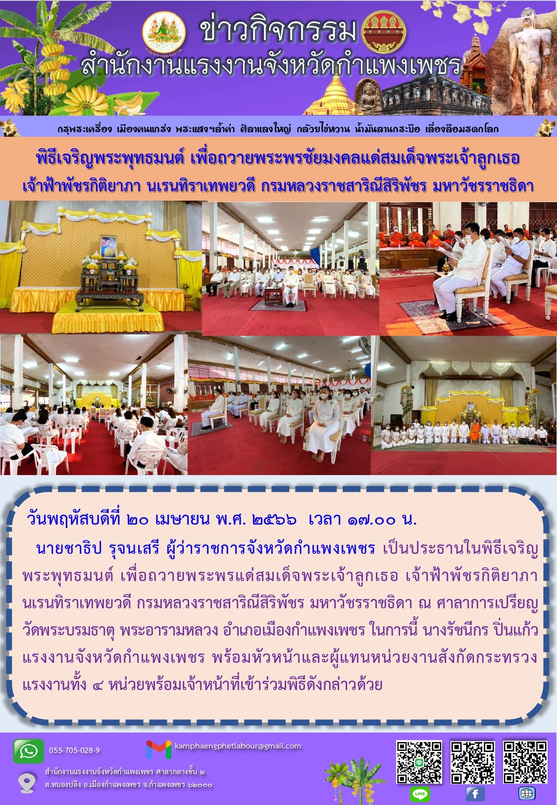 สรจ.กำแพงเพชร พิธีเจริญพระพุทธมนต์ เพื่อถวายพระพรชัยมงคลแด่สมเด็จพระเจ้าลูกเธอ เจ้าฟ้าพัชรกิติยาภา นเรนทิราเทพยวดี กรมหลวงราชสาริณีสิริพัชร มหาวัชรราชธิดา