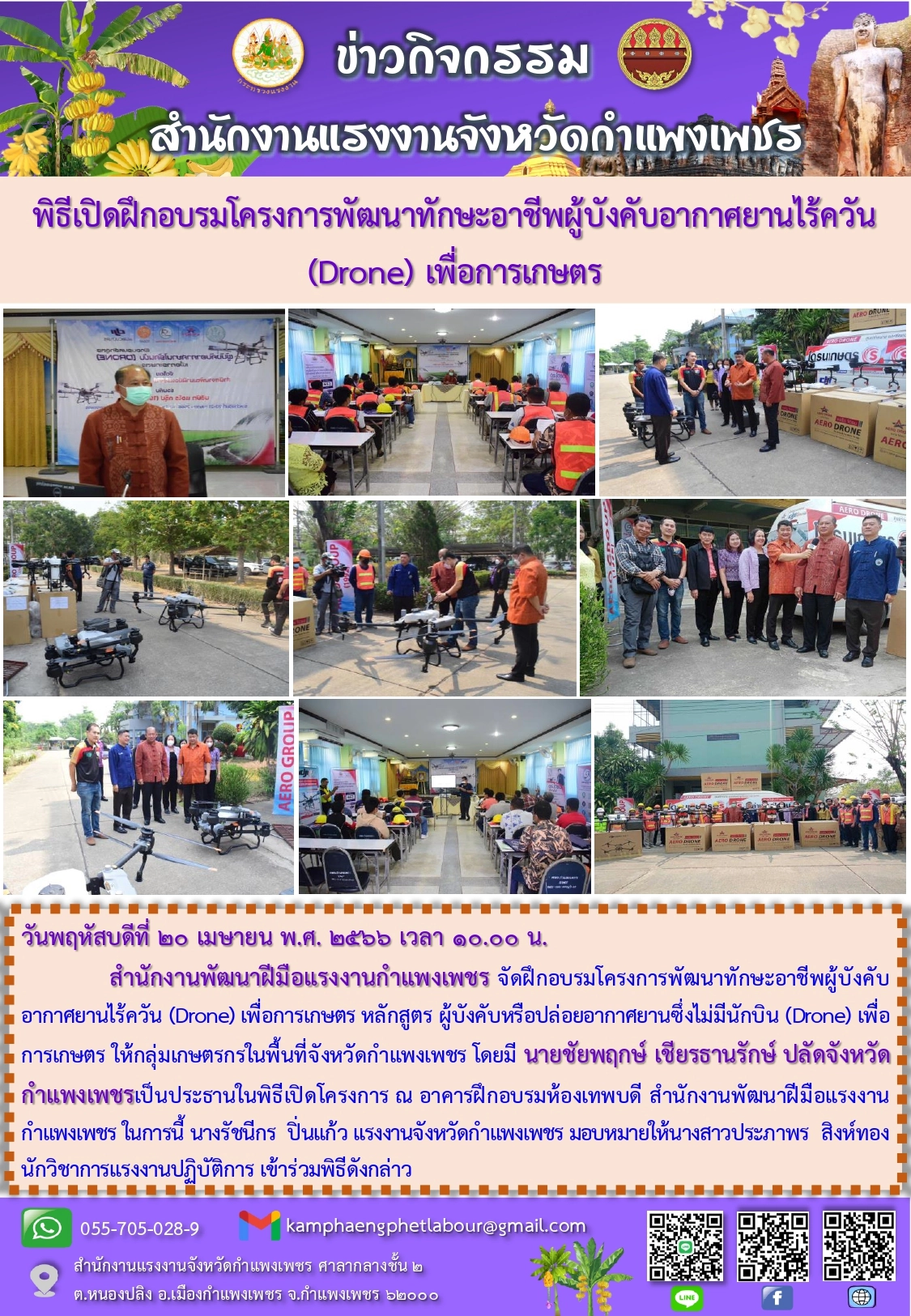 สรจ.กำแพงเพชร พิธีเปิดฝึกอบรมโครงการพัฒนาทักษะอาชีพผู้บังคับอากาศยานไร้ควัน (Drone) เพื่อการเกษตร