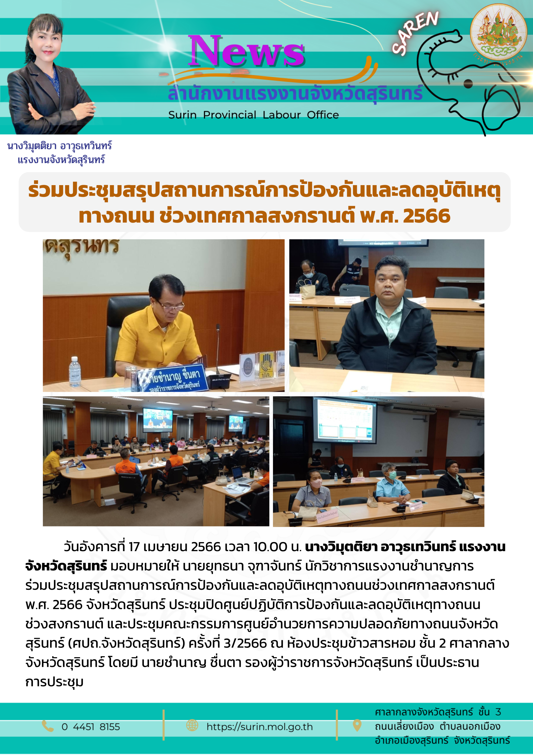 สรจ.สุรินทร์ ร่วมประชุมสรุปสถานการณ์การป้องกันและลดอุบัติเหตุทางถนน ช่วงเทศกาลสงกรานต์ พ.ศ. 2566
