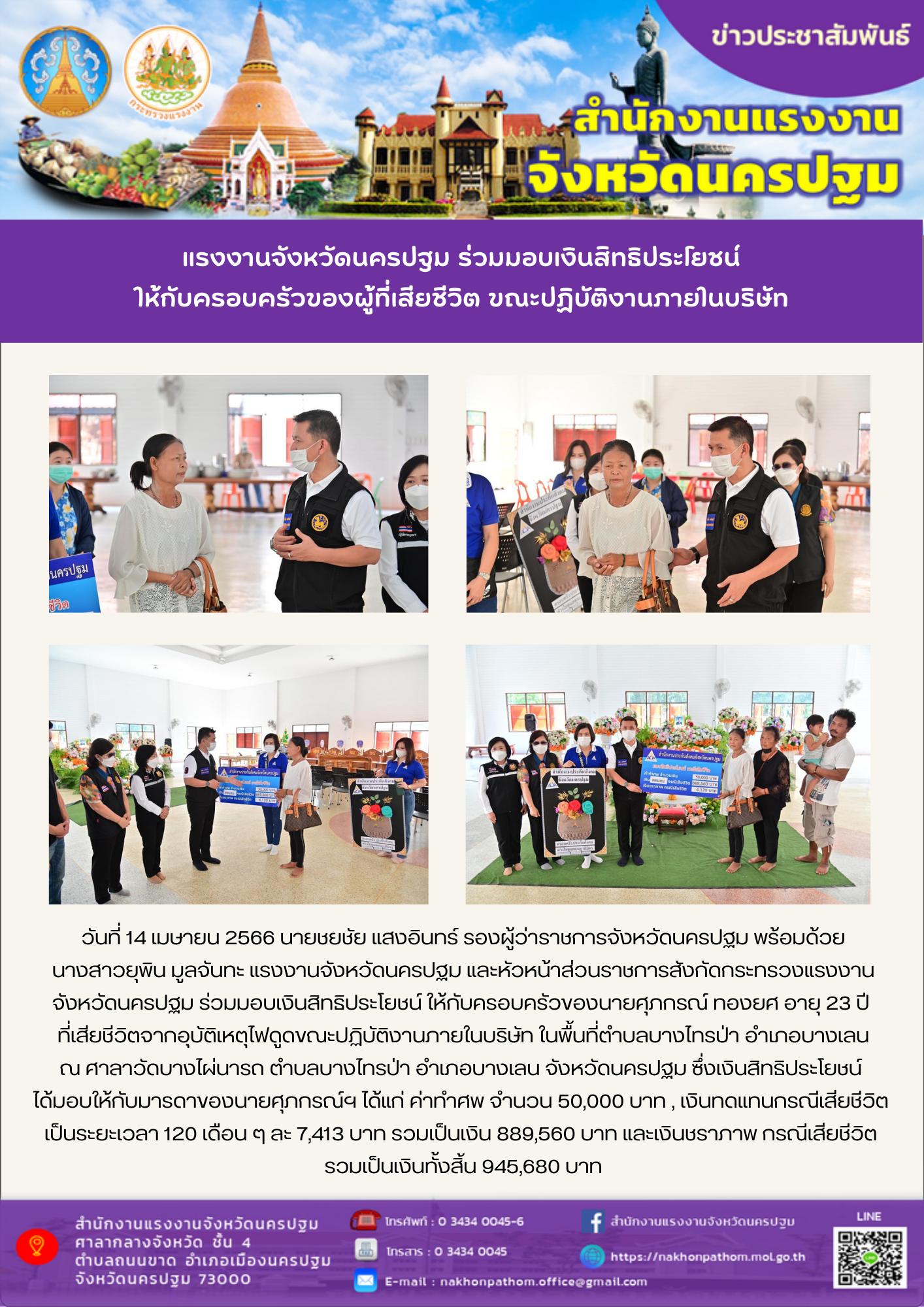 สรจ.นครปฐม ร่วมมอบเงินสิทธิประโยชน์ ให้กับครอบครัวของผู้ที่เสียชีวิต ขณะปฏิบัติงานภายในบริษัท