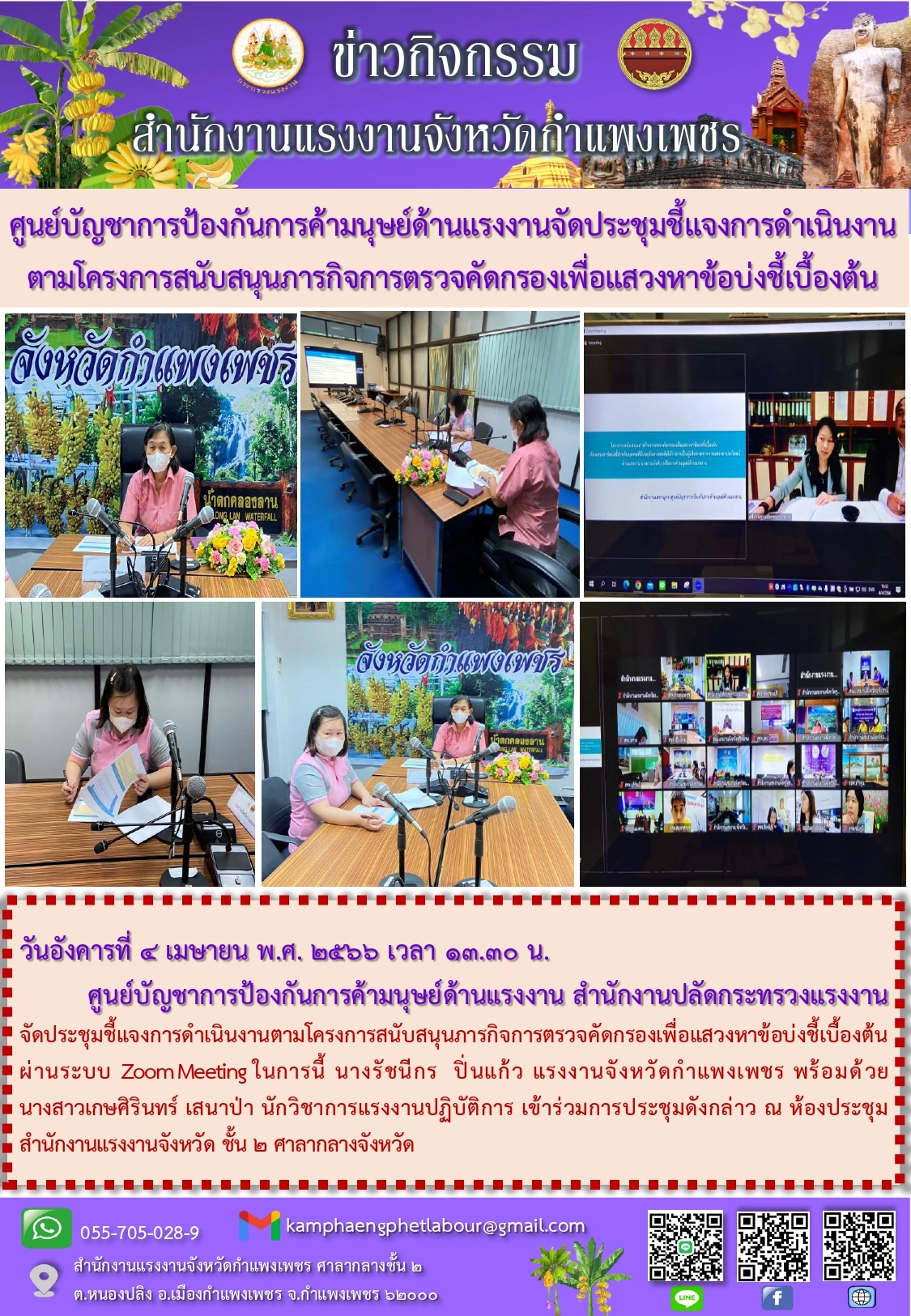 สรจ.กำแพงเพชร ศูนย์บัญชาการป้องกันการค้ามนุษย์ด้านแรงงานจัดประชุมชี้แจงการดำเนินงานตามโครงการสนับสนุนภารกิจการตรวจคัดกรองเพื่อแสวงหาข้อบ่งชี้เบื้องต้น