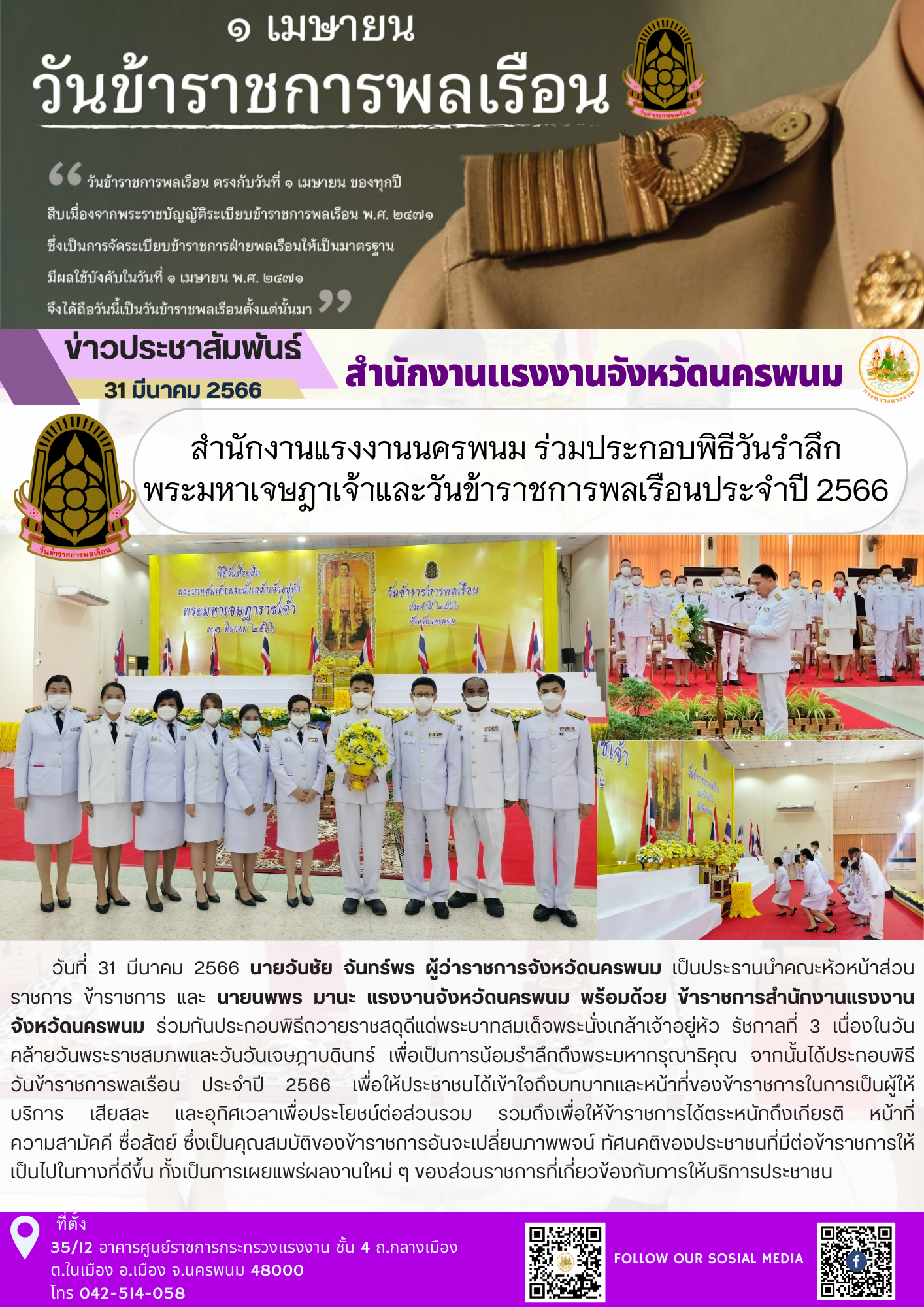 สำนักงานแรงงานนครพนม ร่วมประกอบพิธีวันรำลึก พระมหาเจษฎาเจ้าและวันข้าราชการพลเรือนประจำปี 2566