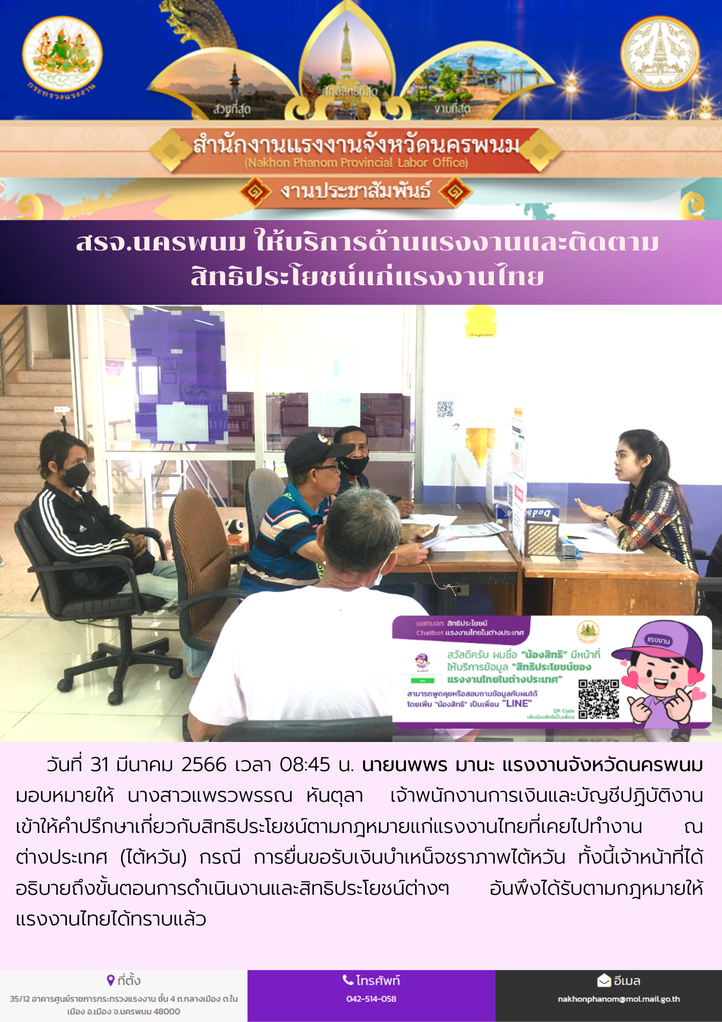 สรจ.นครพนม ให้บริการด้านแรงงานและติดตามสิทธิประโยชน์แก่แรงงานไทย