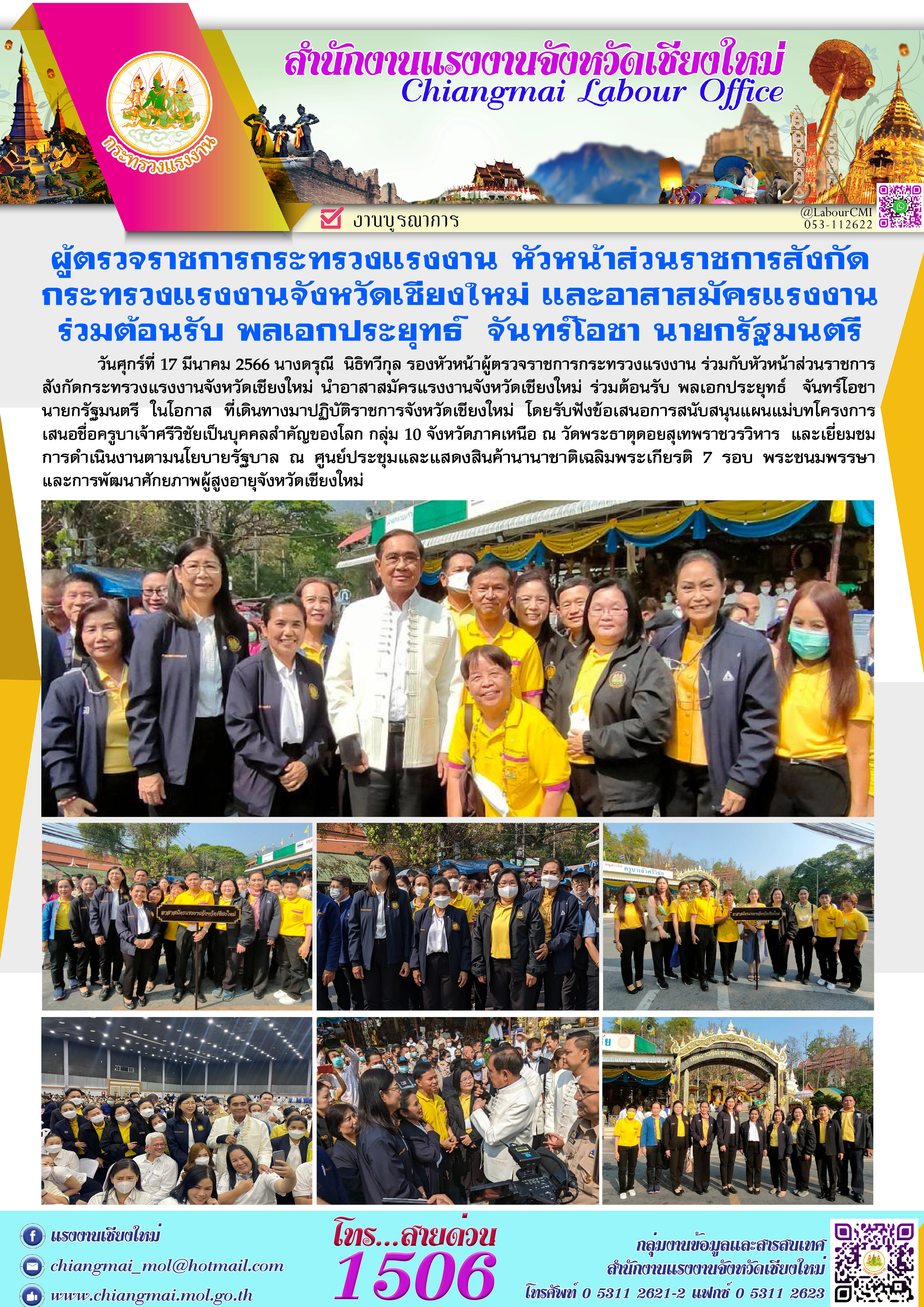 ผู้ตรวจราชการกระทรวงแรงงาน หัวหน้าส่วนราชการสังกัดกระทรวงแรงงานจังหวัดเชียงใหม่ และอาสาสมัครแรงงาน ร่วมต้อนรับ พลเอกประยุทธ์ จันทร์โอชา นายกรัฐมนตรี