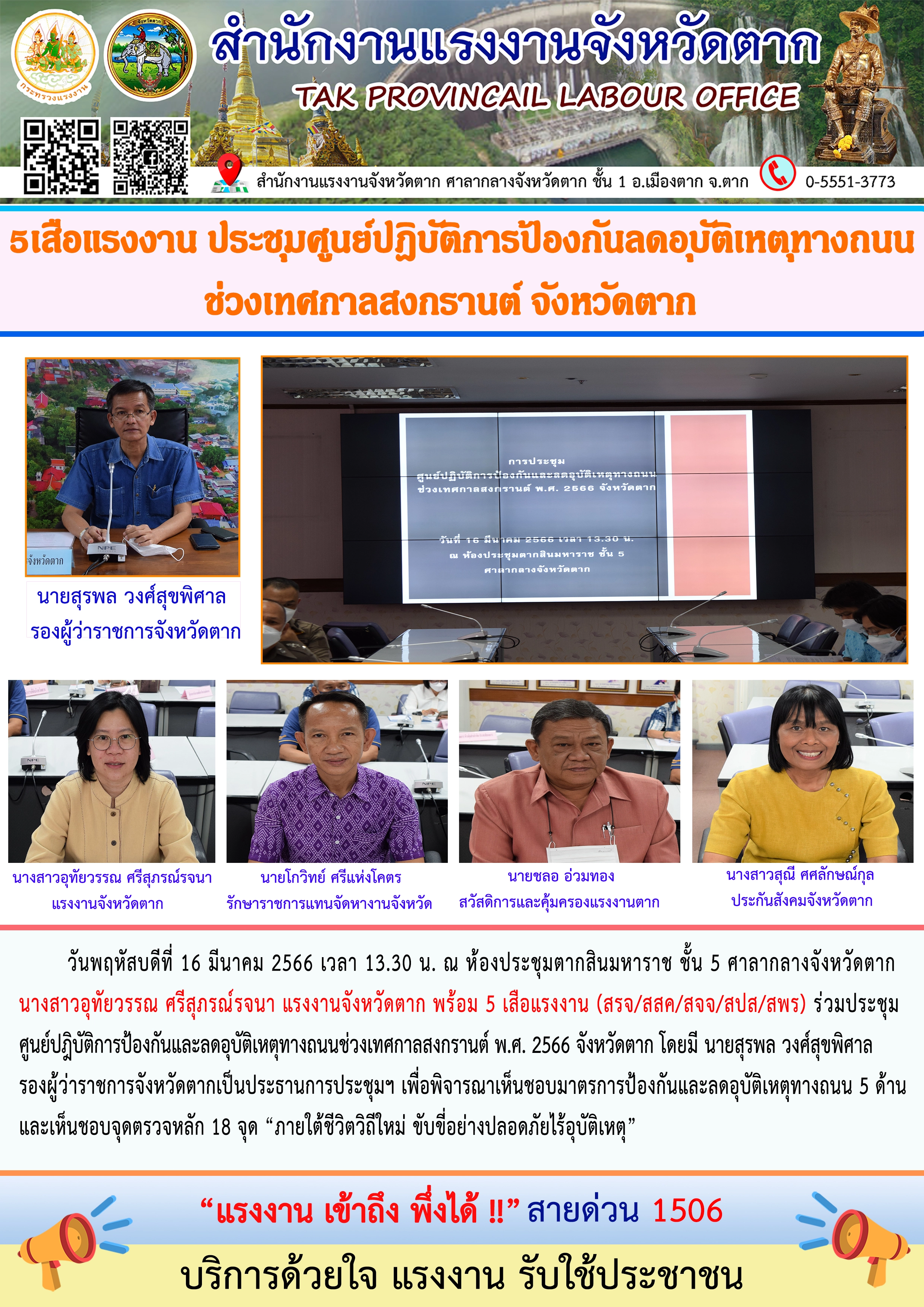 5เสือแรงงาน ประชุมศูนย์ปฎิบัติการป้องกันลดอุบัติเหตุทางถนนช่วงเทศกาลสงกรานต์ จังหวัดตาก