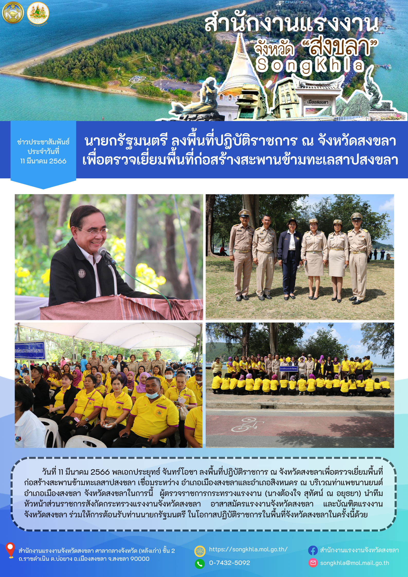 พลเอกประยุทธ์ จันทร์โอชา นายกรัฐมนตรี ลงพื้นที่ปฎิบัติราชการ ณ จังหวัดสงขลา เพื่อตรวจเยี่ยมพื้นที่ก่อสร้างสะพานข้ามทะเลสาปสงขลา