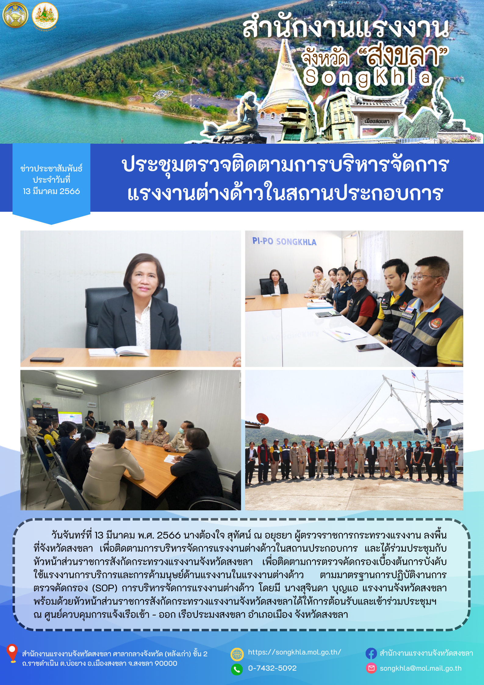 นางต้องใจ สุทัศน์ ณ อยุธยา ผู้ตรวจราชการกระทรวงแรงงาน ลงพื้นที่จังหวัดสงขลา เพื่อติดตามการบริหารจัดการแรงงานต่างด้าวในสถานประกอบการ