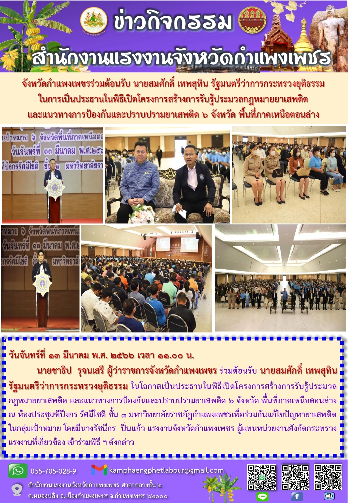 สรจ.กำแพงเพชร ร่วมต้อนรับ นายสมศักดิ์ เทพสุทิน รัฐมนตรีว่าการกระทรวงยุติธรรม ในการเป็นประธานในพิธีเปิดโครงการสร้างการรับรู้ประมวลกฎหมายยาเสพติด และแนวทางการป้องกันและปราบปรามยาเสพติด 6 จังหวัด พื้นที่ภาคเหนือตอนล่าง