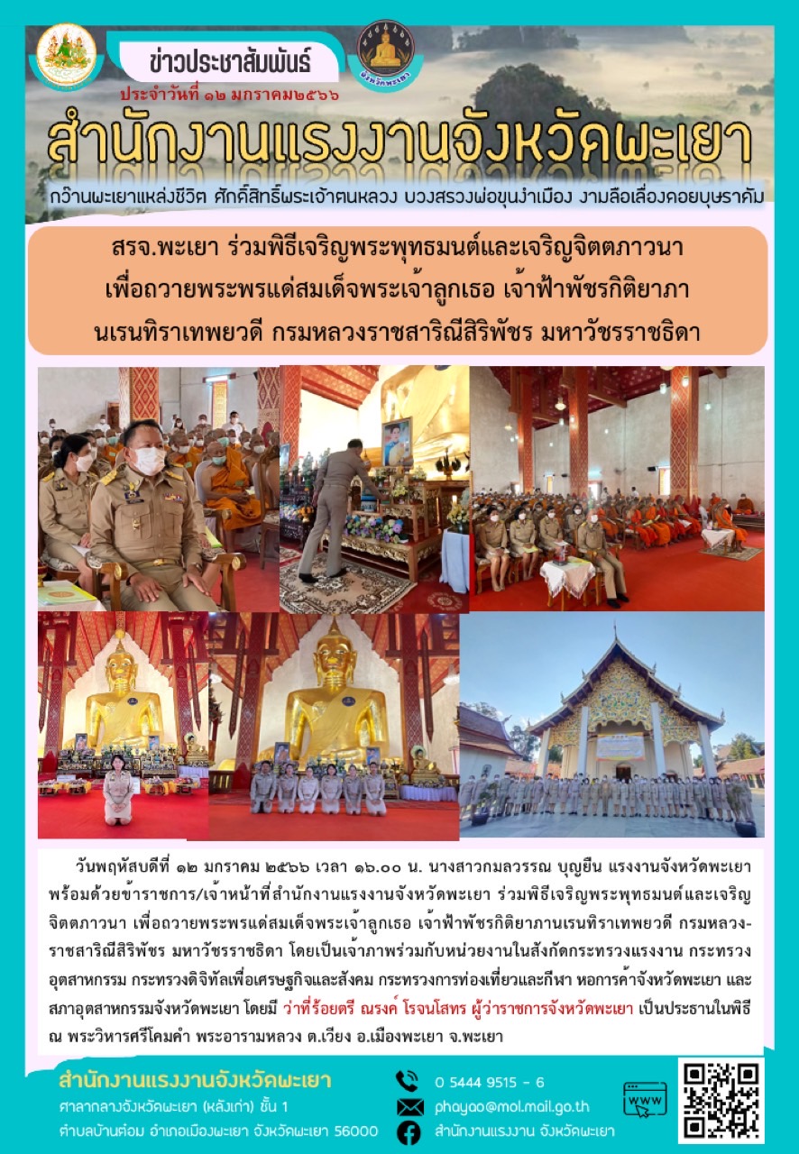 สรจ.พะเยา ร่วมพิธีเจริญพระพุทธมนต์และเจริญจิตตภาวนา เพื่อถวายพระพรแด่สมเด็จพระเจ้าลูกเธอ เจ้าฟ้าพัชรกิติยาภา นเรนทิราเทพยวดี กรมหลวงราชสาริณีสิริพัชร มหาวัชรราชธิดา