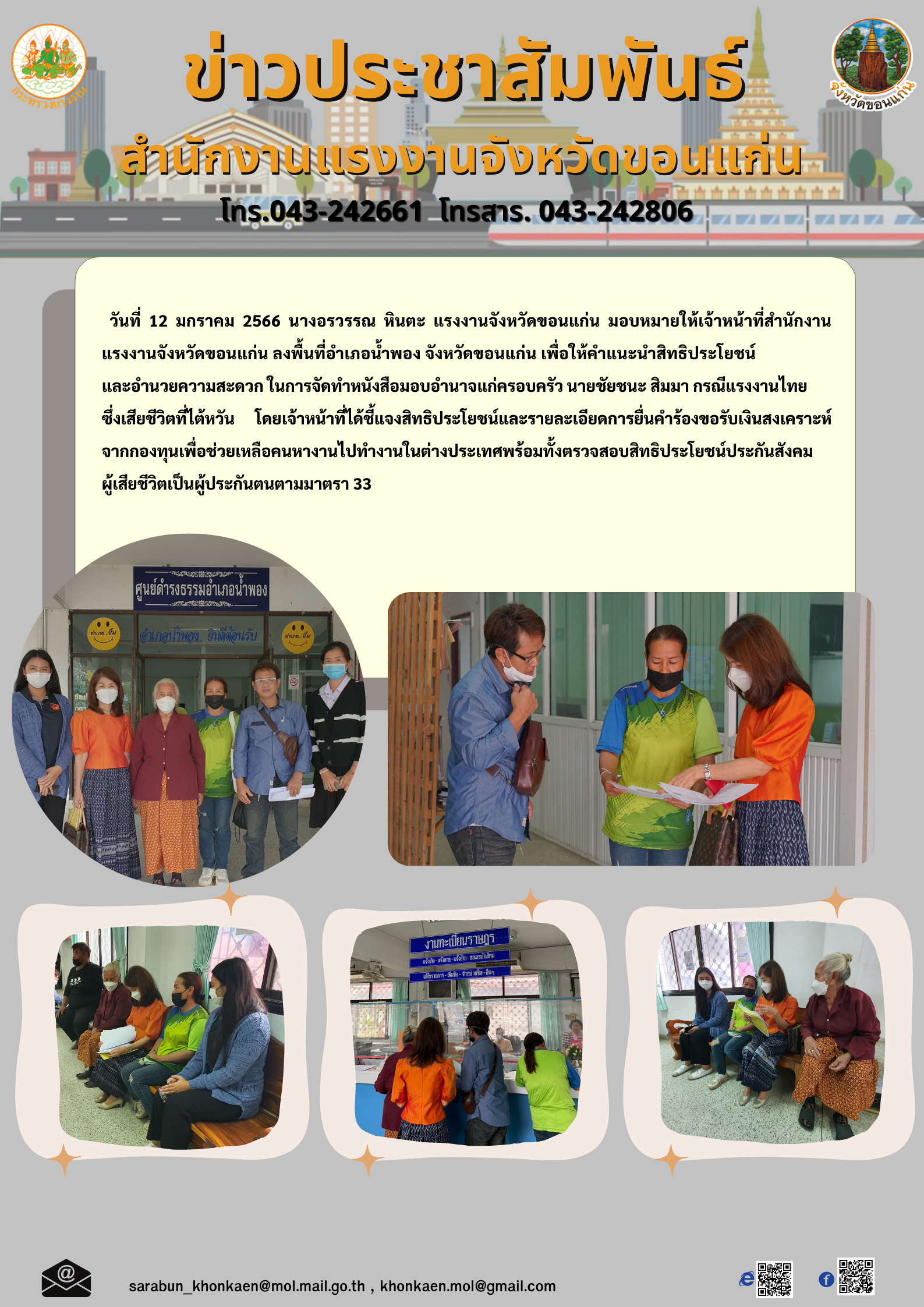 สรจ.ขอนแก่น ลงพื้นที่อำเภอน้ำพอง จังหวัดขอนแก่น เพื่อให้คำแนะนำสิทธิประโยชน์ และอำนวยความสะดวก ในการจัดทำหนังสือมอบอำนาจ กรณีแรงงานไทย ซึ่งเสียชีวิตที่ไต้หวัน