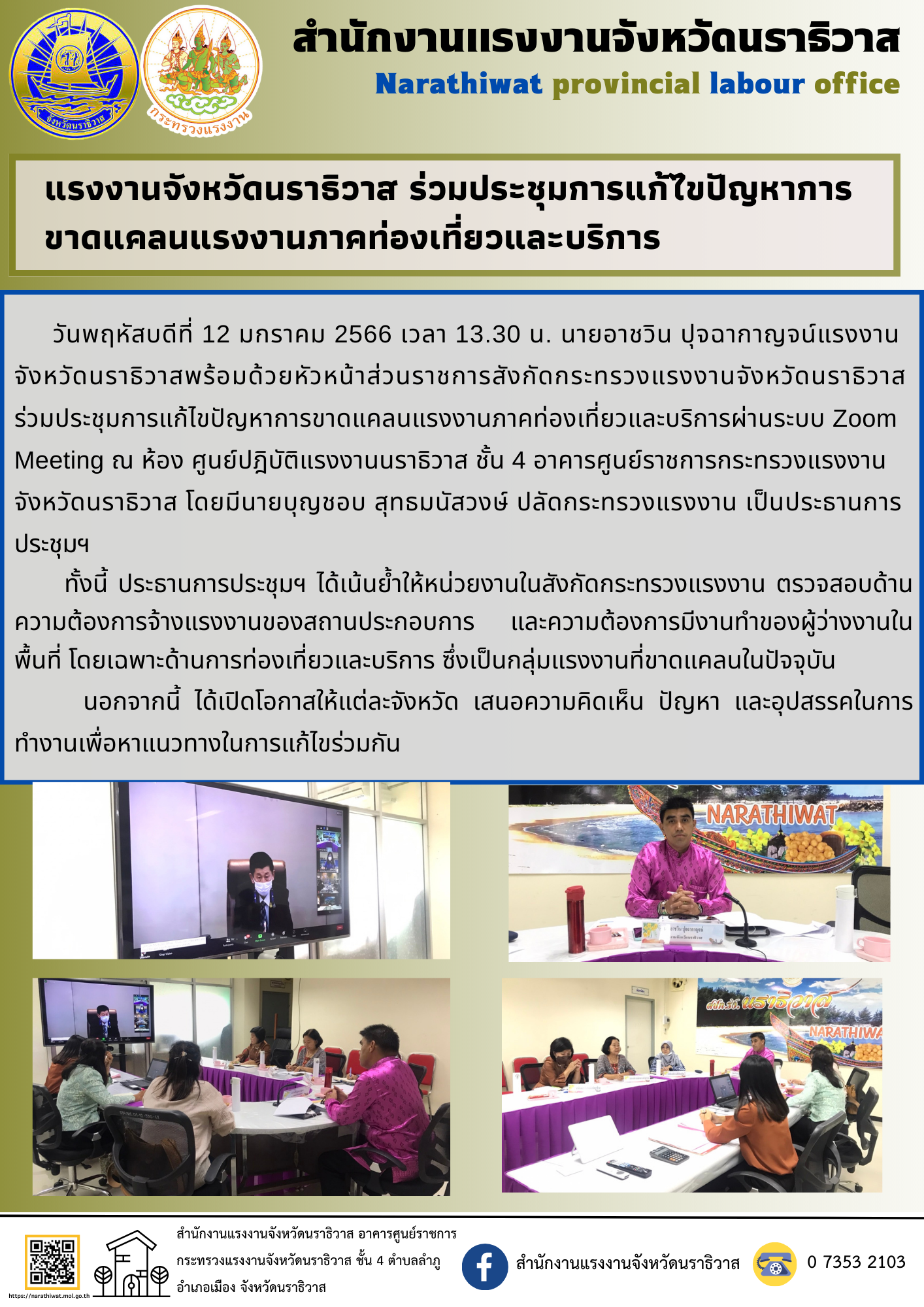 แรงงานจังหวัดนราธิวาส ร่วมประชุมการแก้ไขปัญหาการขาดแคลนแรงงานภาคท่องเที่ยวและบริการ