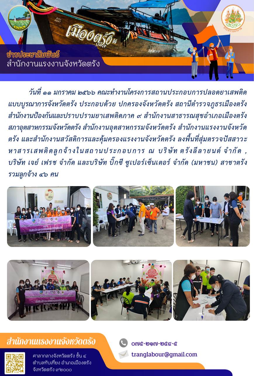 คณะทำงานโครงการสถานประกอบการปลอดยาเสพติดแบบบูรณาการจังหวัดตรัง ลงพื้นที่สุ่มตรวจปัสสาวะหาสารเสพติดลูกจ้างในสถานประกอบการ ณ บริษัท ตรังลีลายนต์ จำกัด บริษัท เจย์ เฟรช จำกัด และบริษัท บิ๊กซี ซูเปอร์เซ็นเตอร์ จำกัด (มหาชน) สาขาตรัง