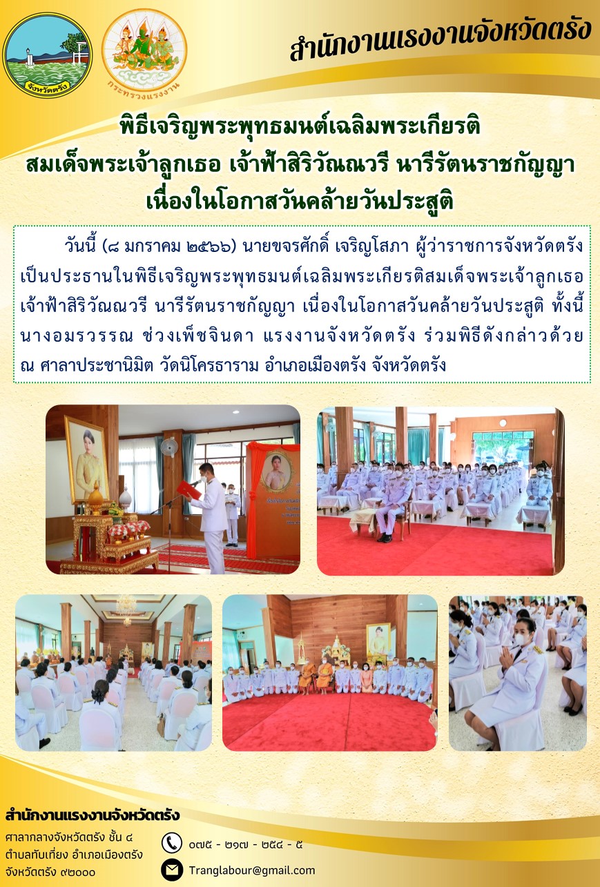 แรงงานจังหวัดตรัง ร่วมพิธีเจริญพระพุทธมนต์เฉลิมพระเกียรติสมเด็จพระเจ้าลูกเธอ เจ้าฟ้าสิริวัณณวรี นารีรัตนราชกัญญา เนื่องในโอกาสวันคล้ายวันประสูติ