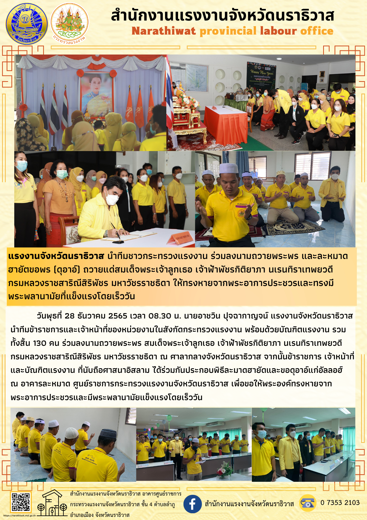 แรงงานจังหวัดนราธิวาส นำทีมชาวกระทรวงแรงงาน ร่วมลงนามถวายพระพร และละหมาดฮายัตขอพร (ดุอาอ์) ถวายแด่สมเด็จพระเจ้าลูกเธอ เจ้าฟ้าพัชรกิติยาภา นเรนทิราเทพยวดี กรมหลวงราชสาริณีสิริพัชร มหาวัชรราชธิดา ให้ทรงหายจากพระอาการประชวรและทรงมี พระพลานามัยที่แข็งแรงโดยเร็ววัน