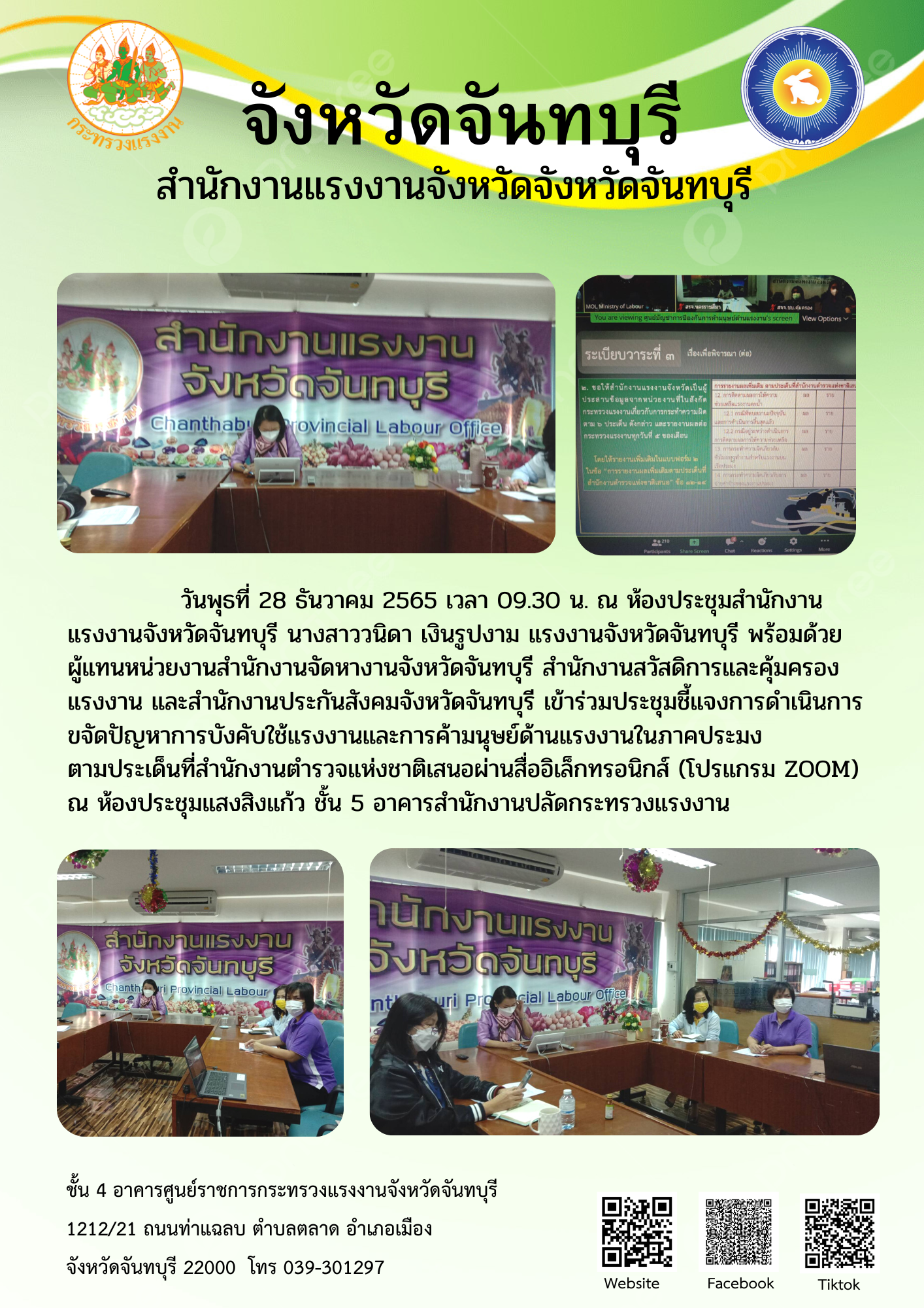 สรจ.จันทบุรี นางสาววนิดา เงินรูปงาม แรงงานจังหวัดจันทบุรี พร้อมด้วย ผู้แทนหน่วยงานสำนักงานจัดหางานจังหวัดจันทบุรี สำนักงานสวัสดิการและคุ้มครองแรงงาน และสำนักงานประกันสังคมจังหวัดจันทบุรี เข้าร่วมประชุมชี้แจงการดำเนินการขจัดปัญหาการบังคับใช้แรงงานและการค้ามนุษย์ด้านแรงงานในภาคประมง