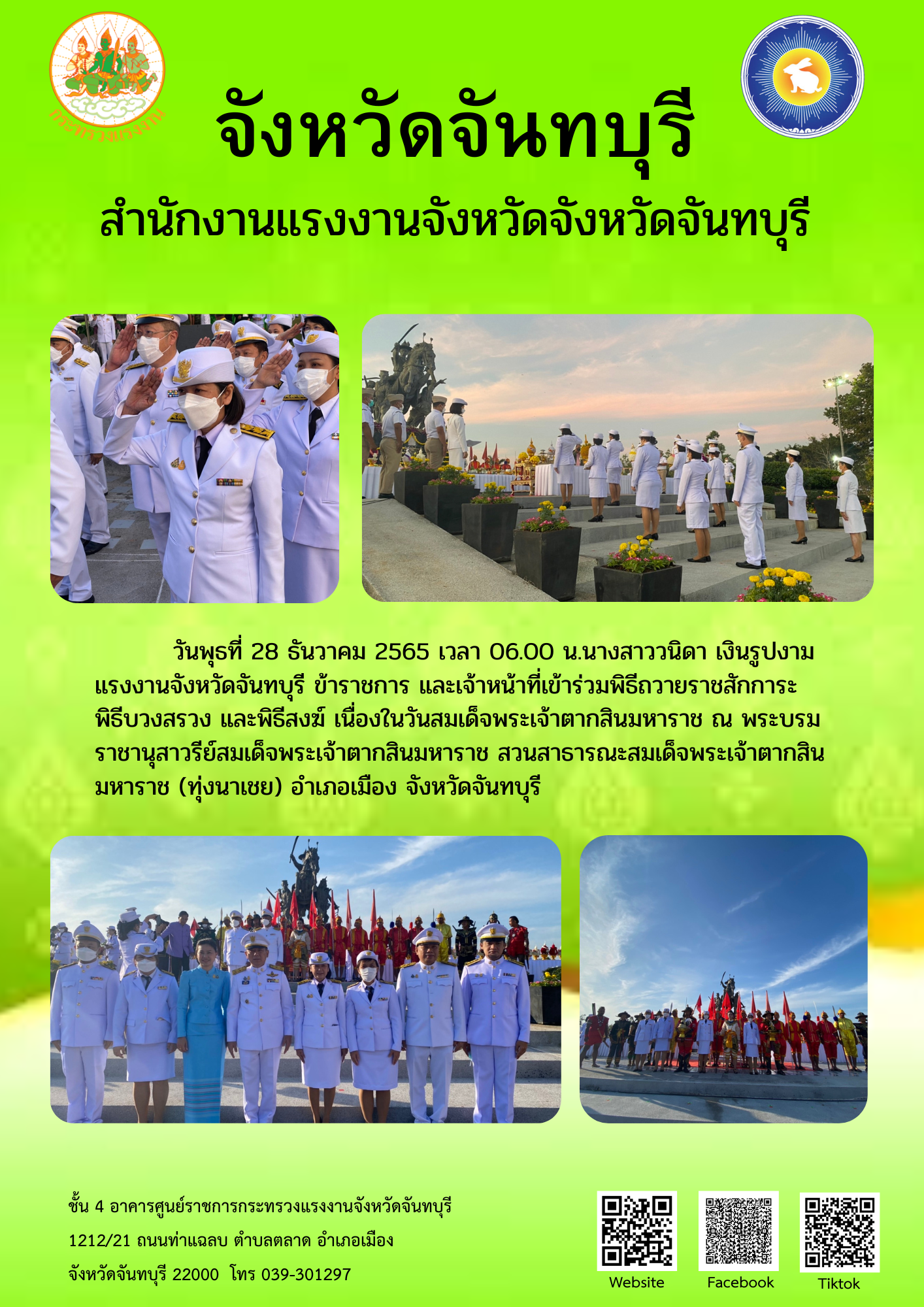 สรจ.จันทบุรี เข้าร่วมพิธีถวายราชสักการะ พิธีบวงสรวง และพิธีสงฆ์ เนื่องในวันสมเด็จพระเจ้าตากสินมหาราช ณ พระบรมราชานุสาวรีย์สมเด็จพระเจ้าตากสินมหาราช สวนสาธารณะสมเด็จพระเจ้าตากสินมหาราช (ทุ่งนาเชย) อำเภอเมือง จังหวัดจันทบุรี