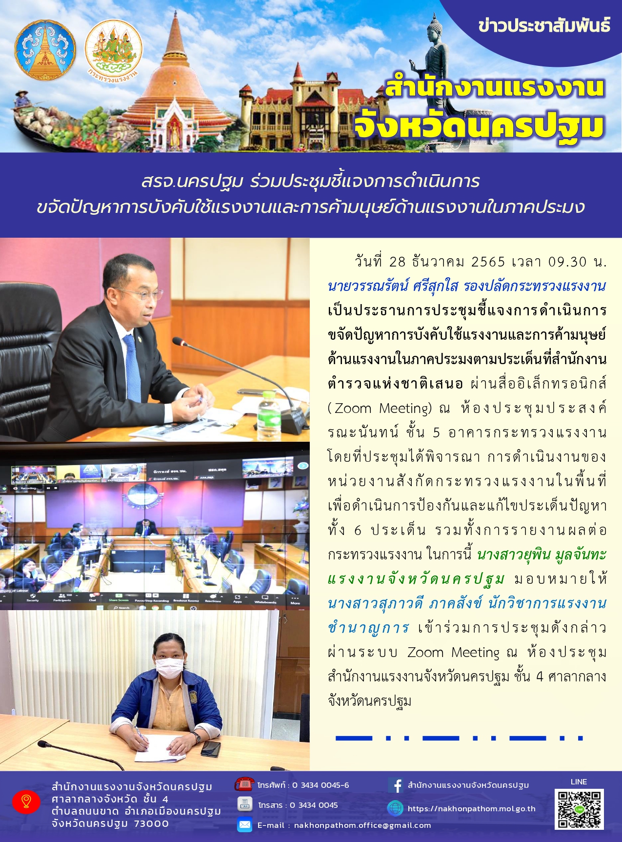 แรงงานจังหวัดพิจิตร มอบหมายเจ้าหน้าที่ประชุมชี้แจงการดำเนินการขจัดปัญหาการบังคับใช้แรงงาน และการค้ามนุษย์ด้านแรงงานในภาคประมงตามประเด็นที่สำนักงานตำรวจแห่งชาติเสนอ