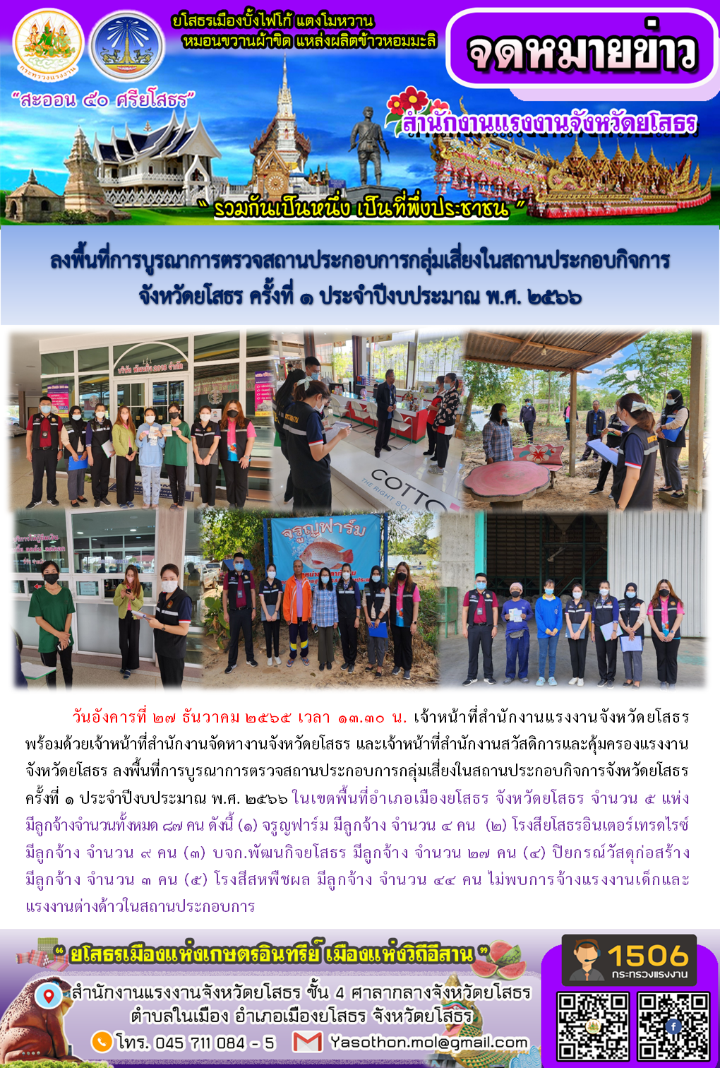 สรจ.ยโสธร ลงพื้นที่การบูรณาการตรวจสถานประกอบการกลุ่มเสี่ยงในสถานประกอบกิจการ จังหวัดยโสธร ครั้งที่ 1 ประจำปีงบประมาณ พ.ศ. 2566