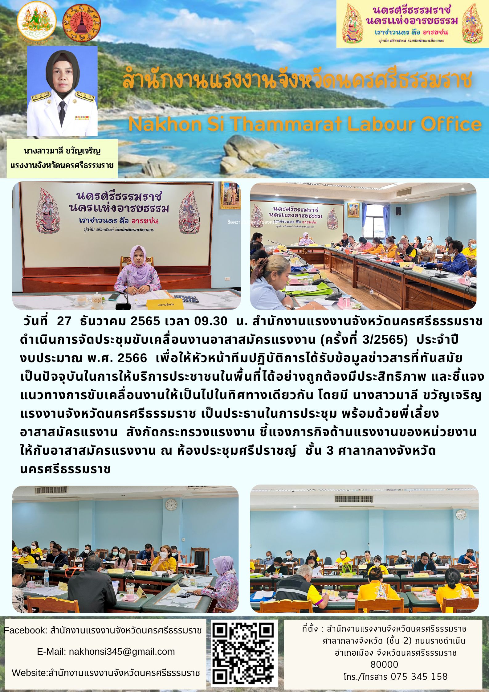 สำนักงานแรงงานจังหวัดนครศรีธรรมราช ดำเนินการจัดประชุมขับเคลื่อนงานอาสาสมัครแรงงาน (ครั้งที่ 3/2565) ประจำปี งบประมาณ พ.ศ. 2566 โดยมี นางสาวมาลี ขวัญเจริญ แรงงานจังหวัดนครศรีธรรมราช เป็นประธานในการประชุม