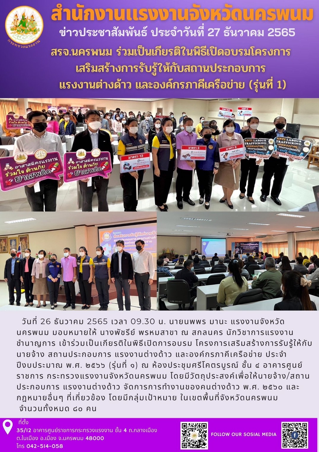 สรจ.นครพนม ร่วมเป็นเกียรติในพิธีเปิดอบรมโครงการเสริมสร้างการรับรู้ให้กับสถานประกอบการ แรงงานต่างด้าว และองค์กรภาคีเครือข่าย (รุ่นที่ 1)