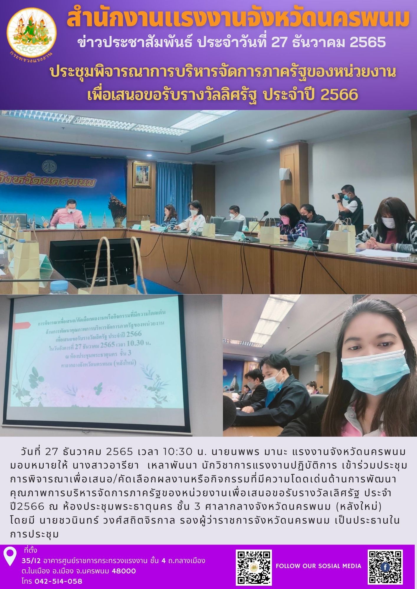 สรจ.นครพนม ร่วมประชุมการพิจารณาเพื่อเสนอ/คัดเลือกผลงานหรือกิจกรรมที่มีความโดดเด่นด้านการพัฒนาคุณภาพการบริหารจัดการภาครัฐของหน่วยงานเพื่อเสนอขอรับรางวัลเลิศรัฐ ประจำปี 2566