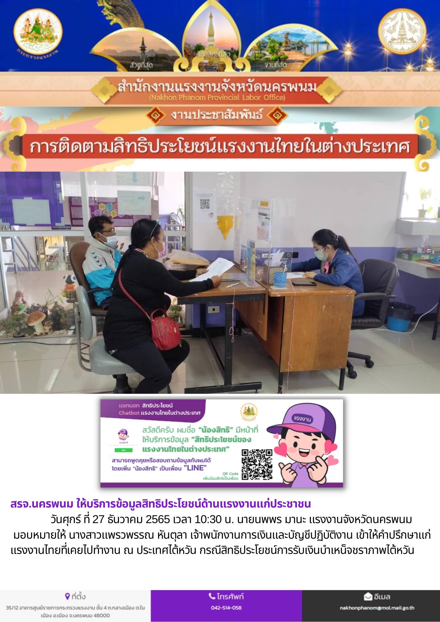 สรจ.นครพนม ให้บริการข้อมูลสิทธิประโยชน์ด้านแรงงานแก่ประชาชน