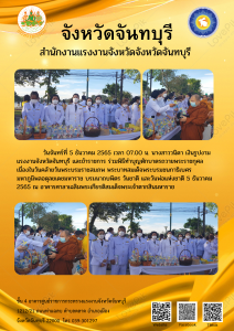 วันจันทร์ที่ 5 ธันวาคม 2565 เวลา 07.00 น. นางสาววนิดา เงินรูปงาม แรงงานจังหวัดจันทบุรี และข้าราชการ ร่วมพิธีทำบุญตักบาตรถวายพระราชกุศล เนื่องในวันคล้ายวันพระบรมราชสมภพ พระบาทสมเด็จพระบรมชนกาธิเบศร มหาภูมิพลอดุลยเดชมหาราช บรมนาถบพิตร วันชาติ และวันพ่อแห่งชาติ 5 ธันวาคม 2565 ณ อาคารศาลาเฉลิมพระเกียรติสมเด็จพระเจ้าตากสินมหาราช