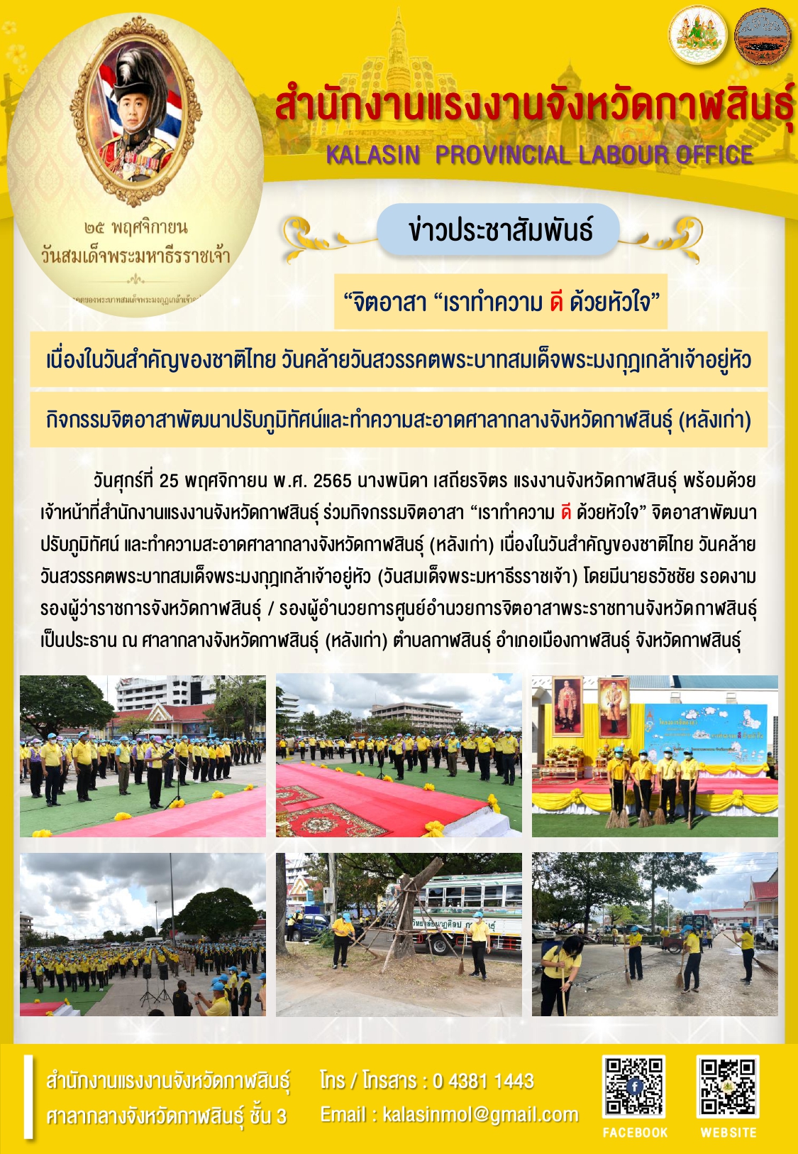 จิตอาสา “เราทำความ ดี ด้วยหัวใจ” กิจกรรมจิตอาสาพัฒนาปรับภูมิทัศน์ และทำความสะอาดศาลากลางจังหวัดกาฬสินธุ์ (หลังเก่า) เนื่องในวันสำคัญของชาติไทย วันคล้ายวันสวรรคตพระบาทสมเด็จพระมงกุฎเกล้าเจ้าอยู่หัว (วันสมเด็จพระมหาธีรราชเจ้า)